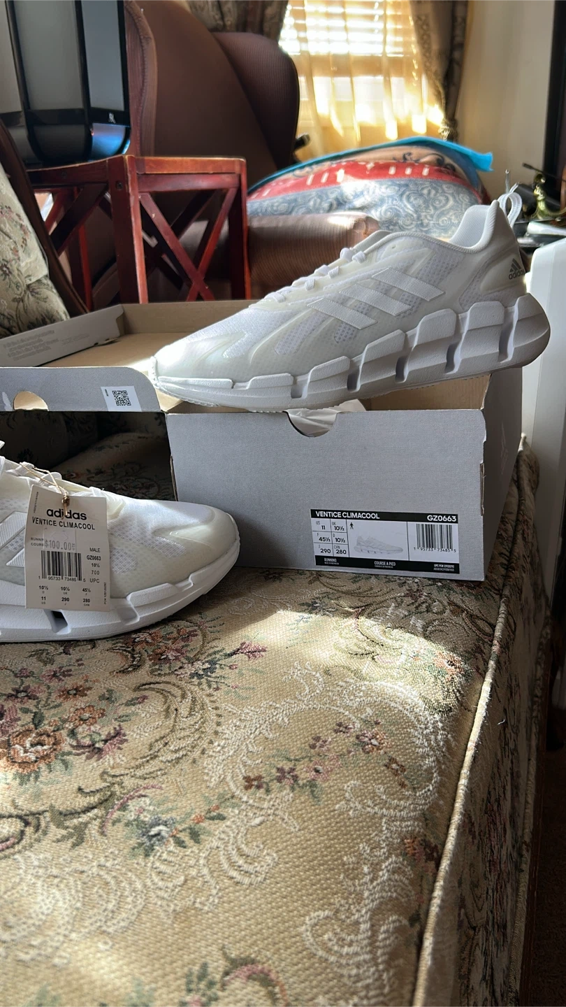 White Adidas Ventice ClimaCool running shoes. Includes original box. Size is 10.5 (285mm). These shoes are great for staying cool during runs!