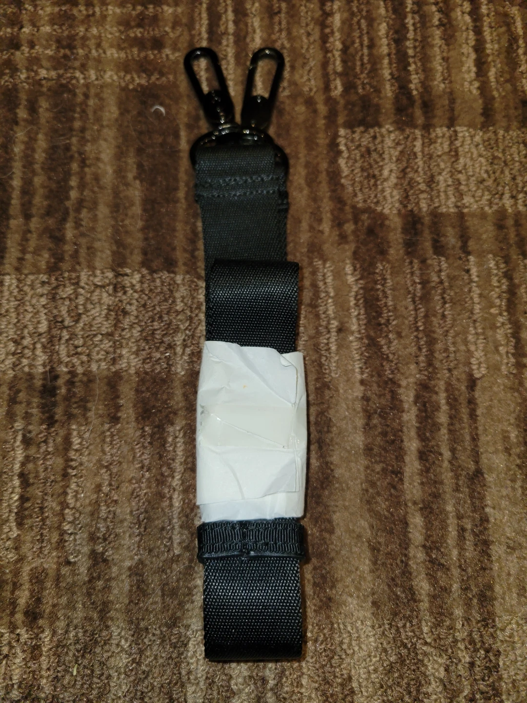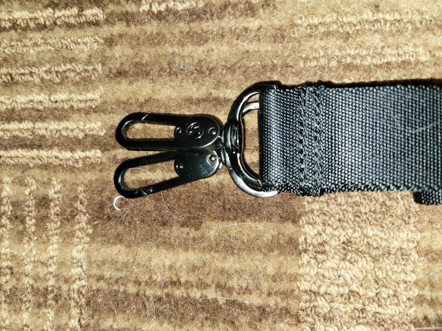 A black nylon strap with two silver-toned swivel clasps. This strap is suitable for bags or other accessories requiring a detachable strap. The clasps allow for easy attachment and removal.
