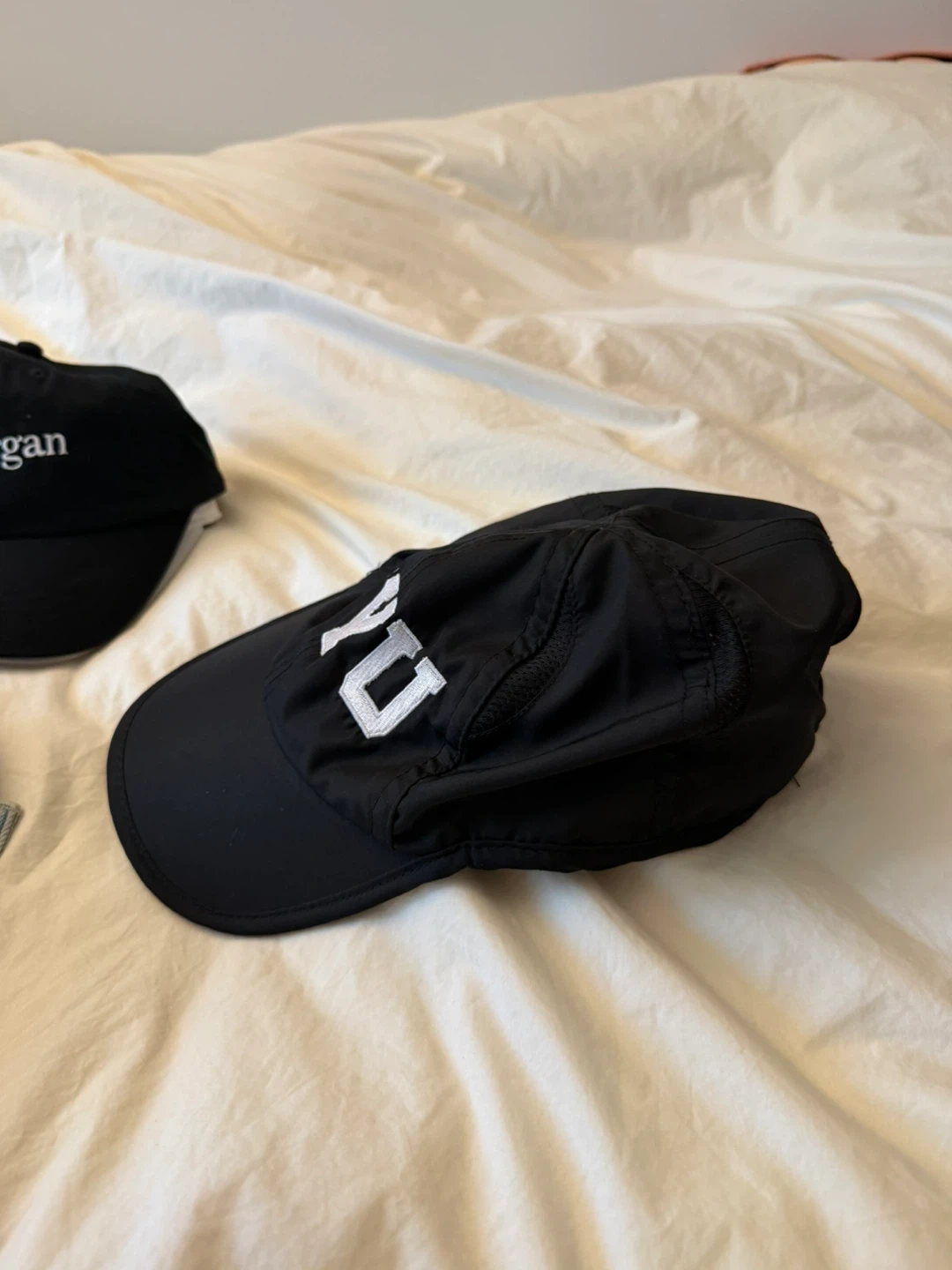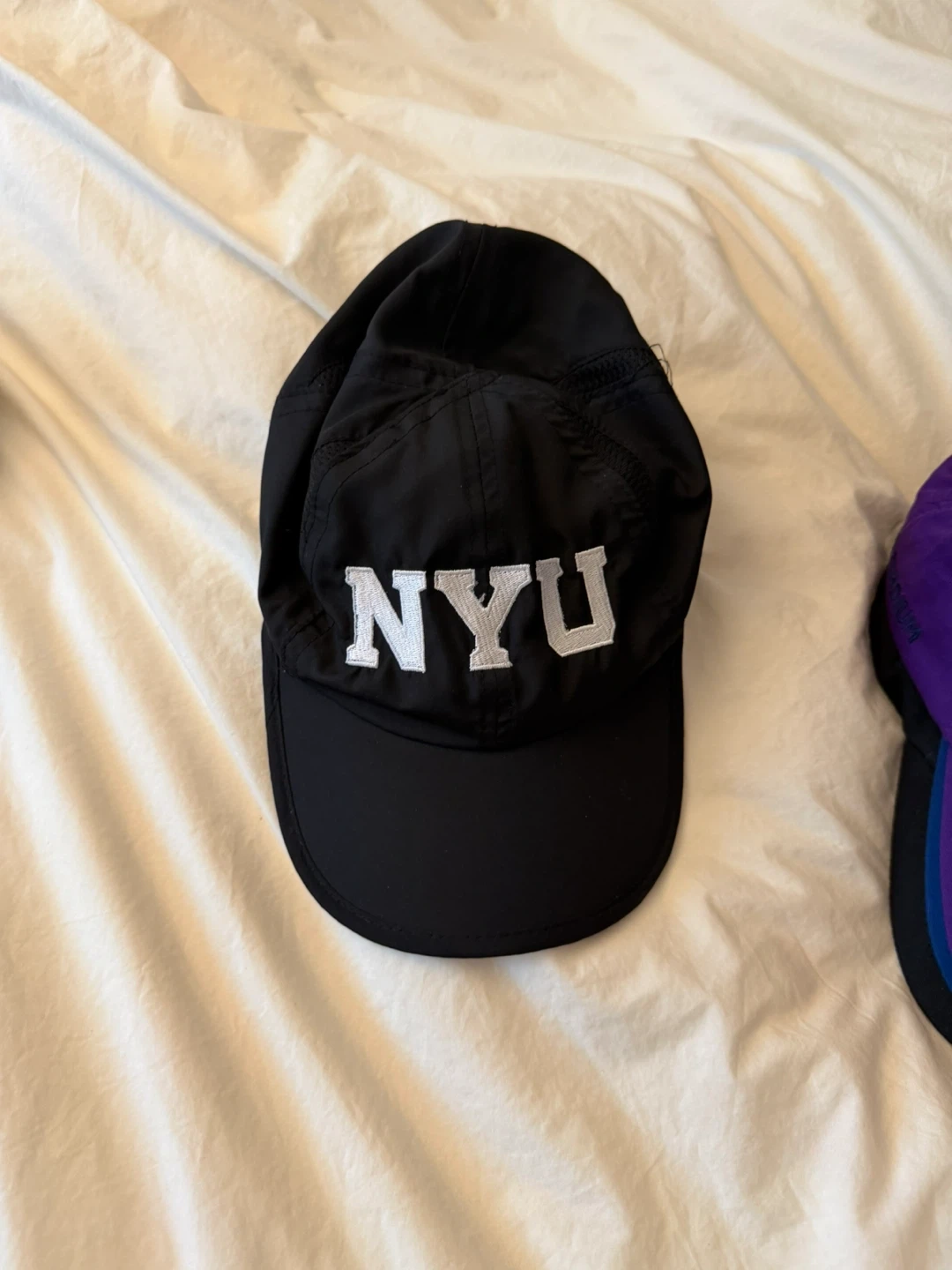 This is a black baseball cap with "NYU" embroidered on the front in white. It's made of a lightweight material, possibly nylon or polyester. The cap has a classic curved brim and an adjustable strap at the back for a comfortable fit. It's a simple, sporty accessory.