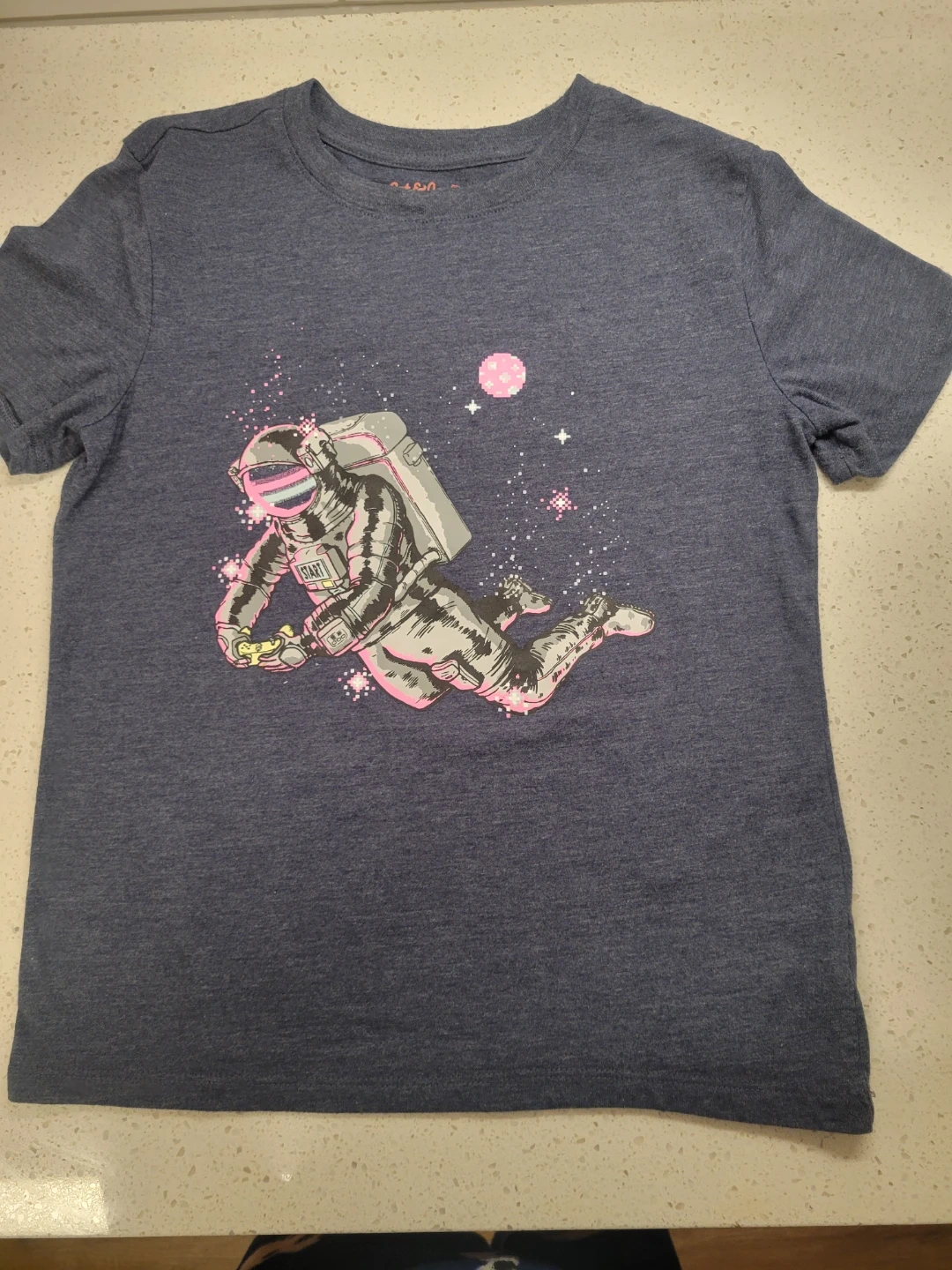 This blue heather t-shirt features an astronaut graphic with "Start" on the helmet. It's made from a soft, comfortable fabric. Perfect for kids who love space and adventure!