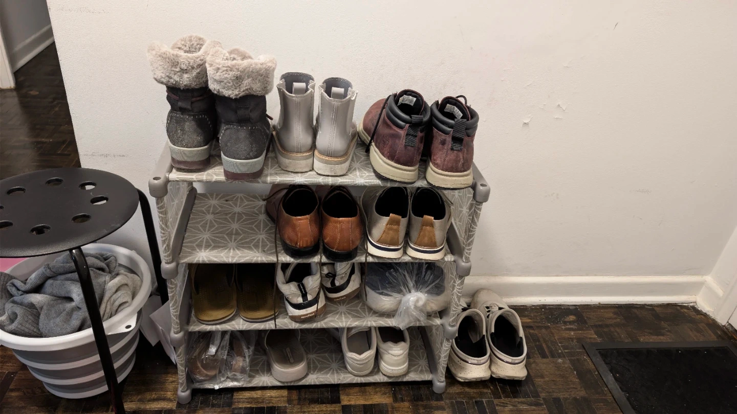 A grey 3-tier shoe rack with a geometric pattern. It's perfect for organizing footwear in hallways or closets. Dimensions are approximately 30 inches high by 24 inches wide.