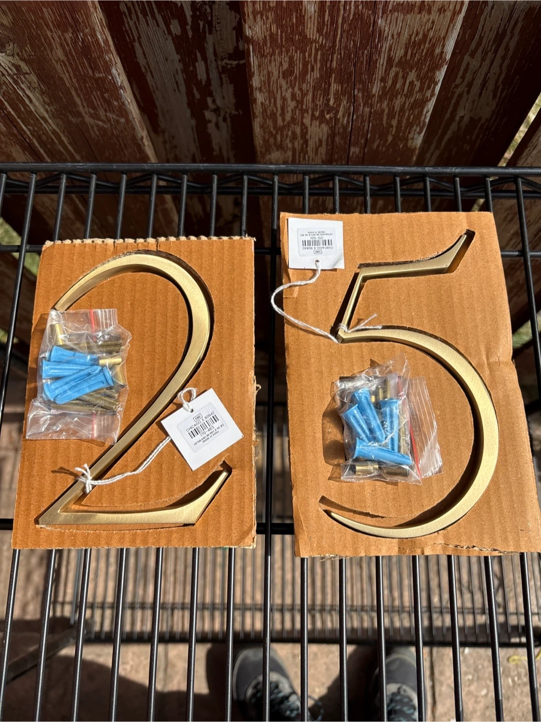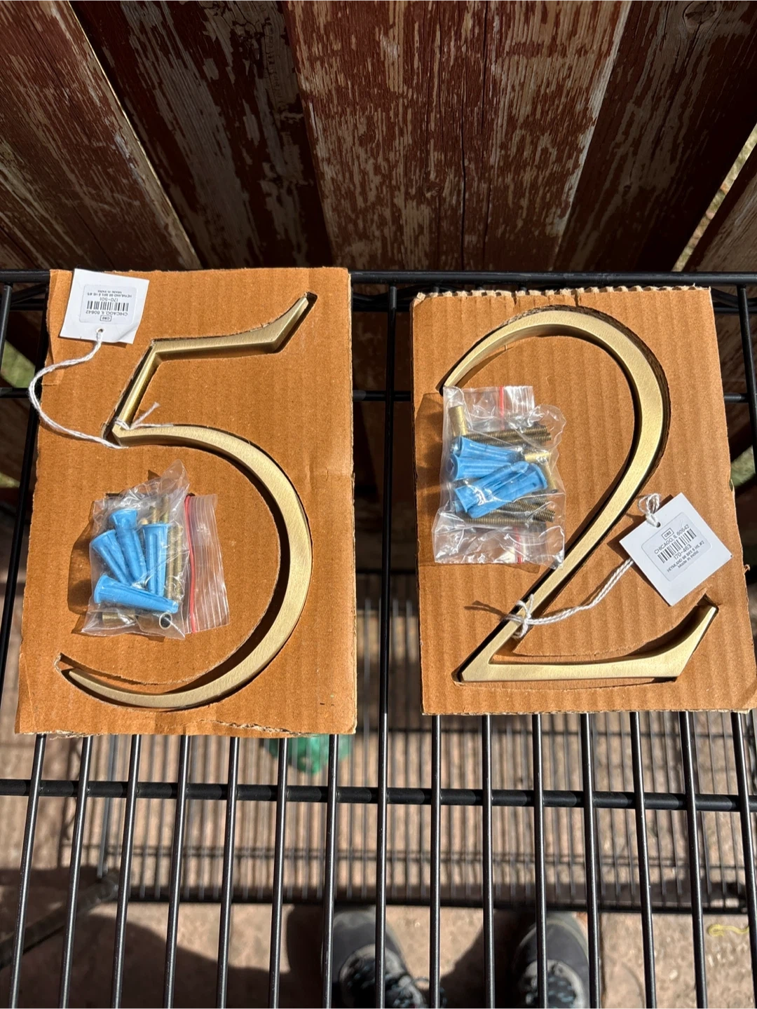 Set of two brass house numbers, featuring a '5' and a '2'. Each number includes mounting hardware and anchors for installation. These are great for updating your home's exterior address.