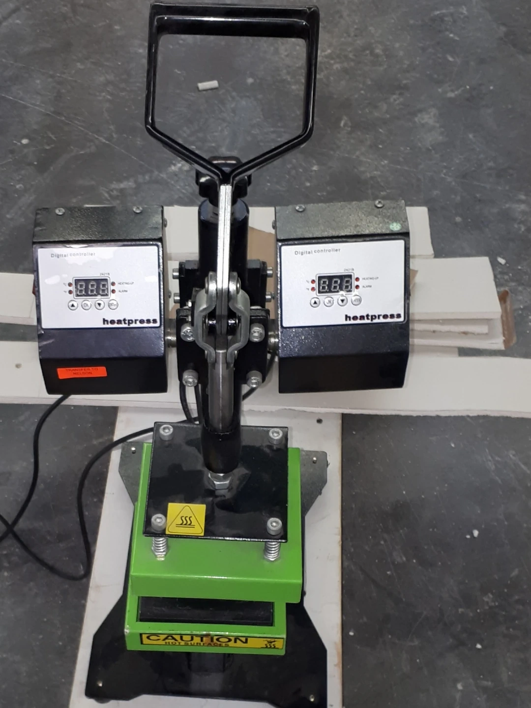 This is a heatpress machine with a digital controller. It has a black and green design and features dual digital displays. It's suitable for various heat transfer applications. Be aware that surfaces are hot!