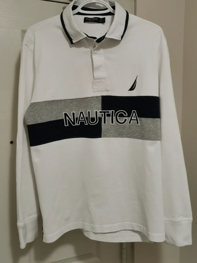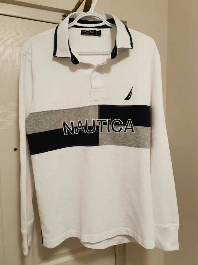 My in excellent condition Size L White with Grey & Blue accents Rugby style shirt would be perfect for outdoors and cooler weather, especially since Fall π is upon us!