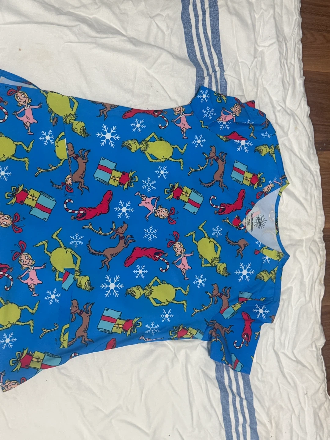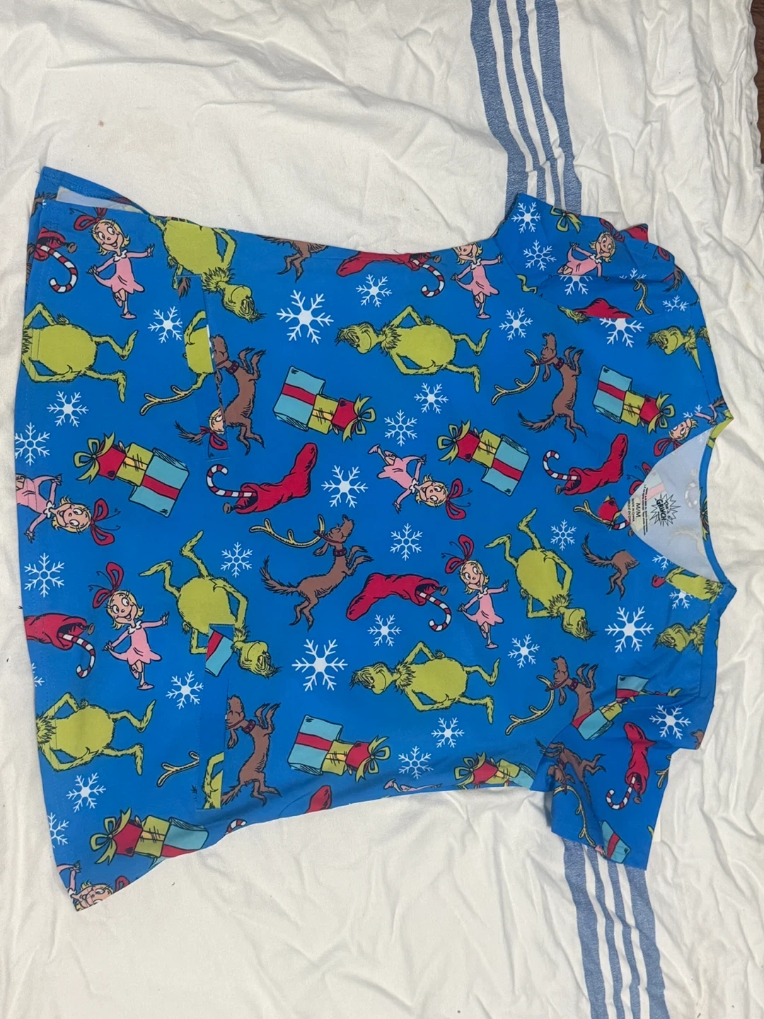 A fun blue scrub top featuring characters from The Grinch. It's adorned with images of the Grinch, Cindy Lou Who, Max the dog, and presents. Made from a comfortable fabric blend.