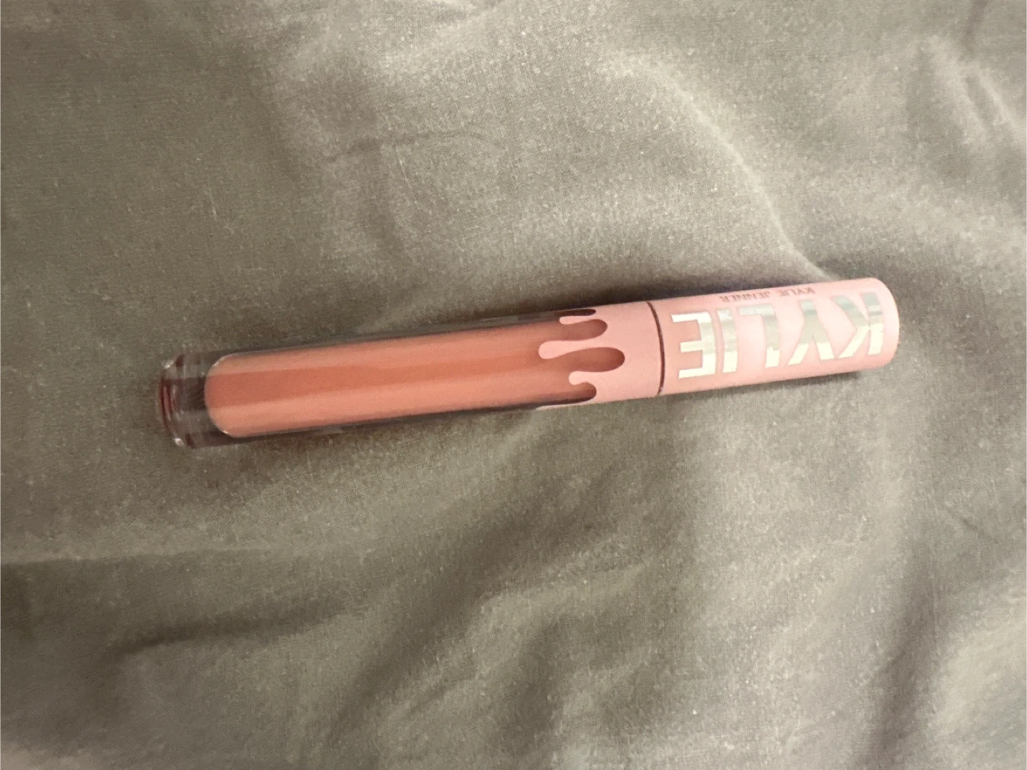This is a Kylie Cosmetics lip gloss in a peachy nude shade. It's a long-lasting formula. The gloss is housed in a clear tube with a light pink cap featuring the brand name.