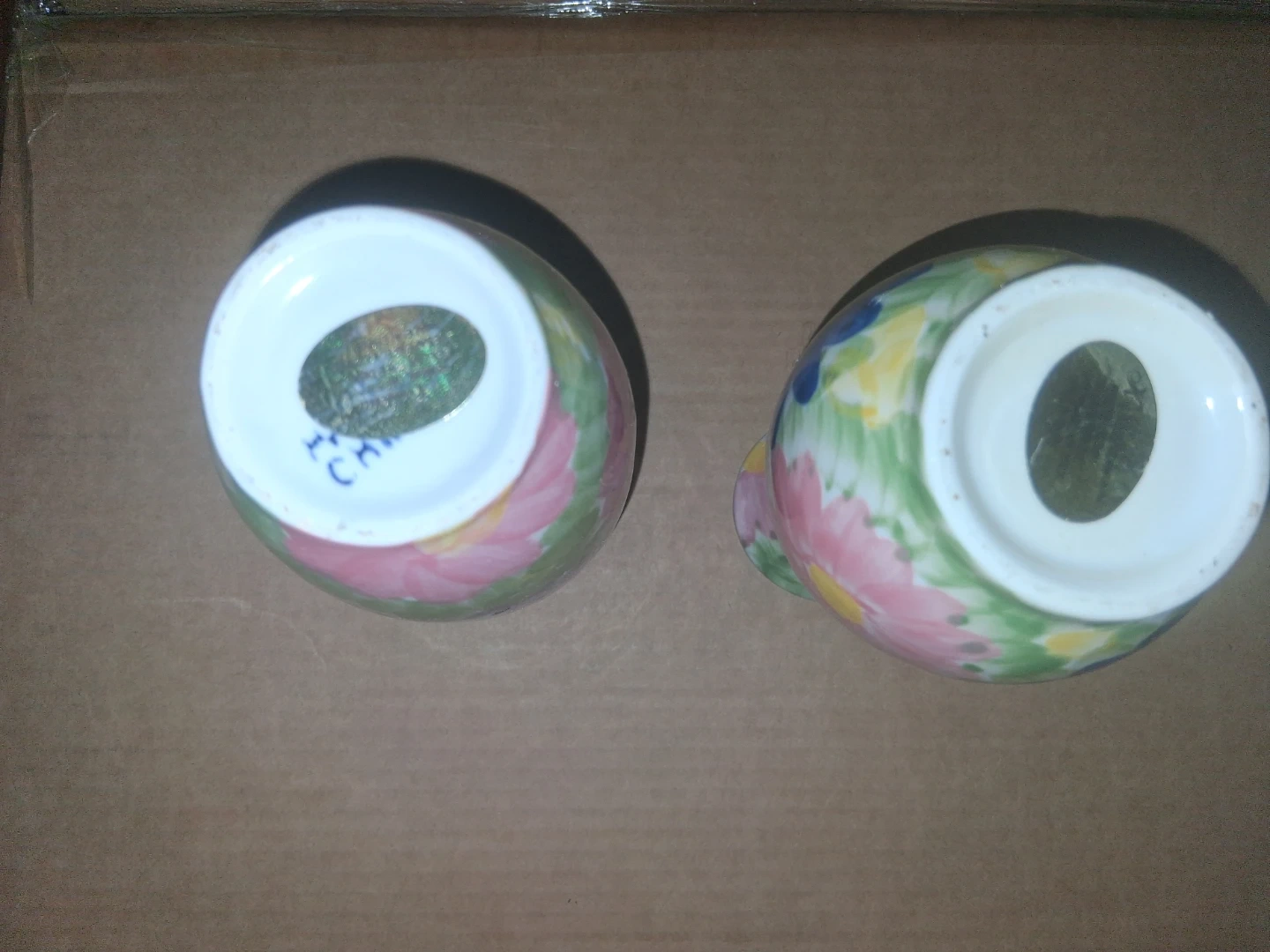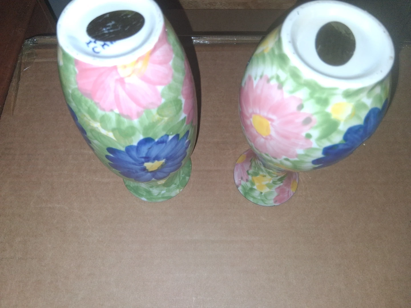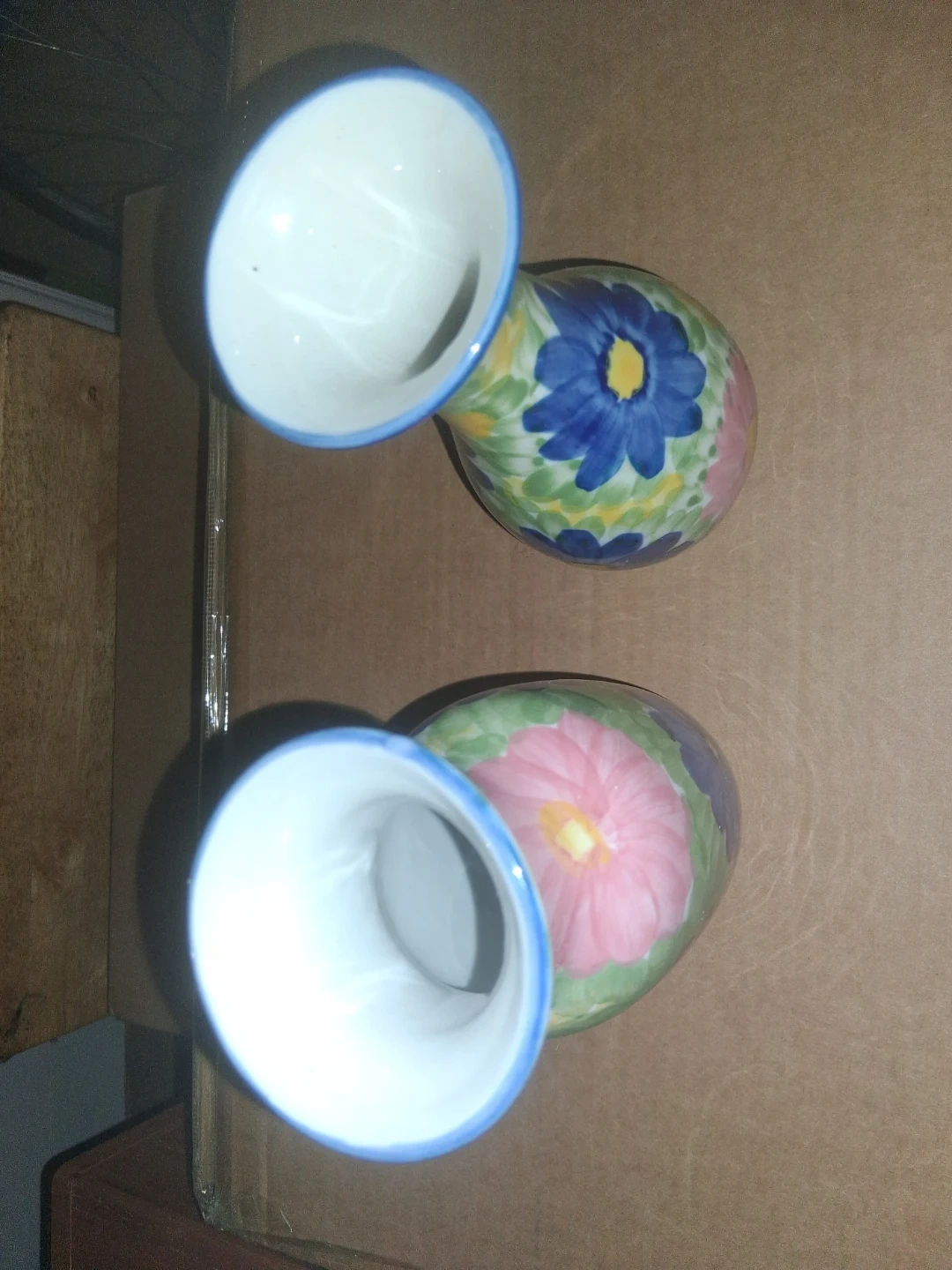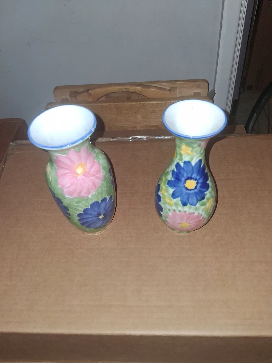 A set of two decorative ceramic vases, each hand-painted with a vibrant floral design. Features pink, blue, and yellow flowers on a green background with a blue rim. These charming vases are perfect for displaying small bouquets or as standalone decorative pieces.