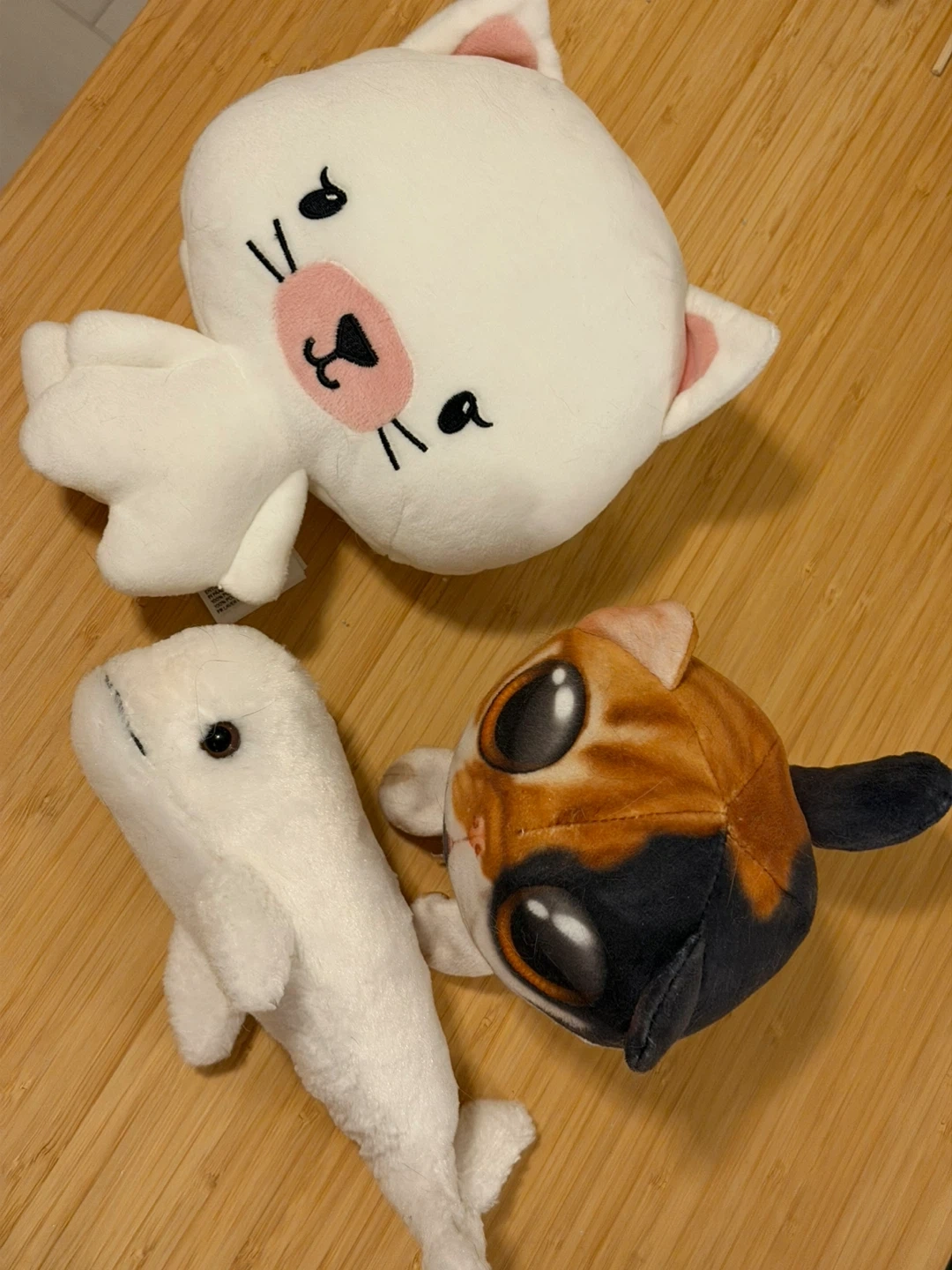 Set of 3 Plush Toys: Cat, Beluga Whale, and Calico Cat