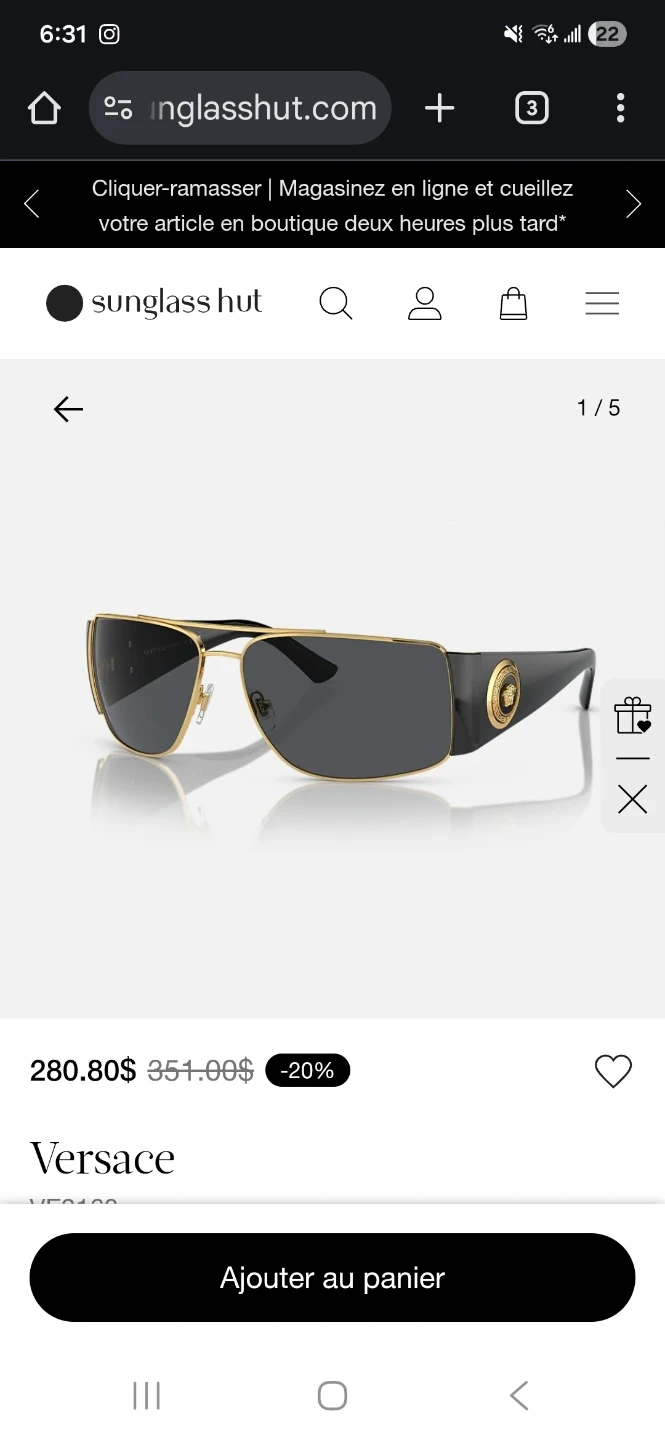 Versace sunglasses with a gold and black frame. Features the iconic Medusa head logo on the sides. Stylish and protective eyewear.