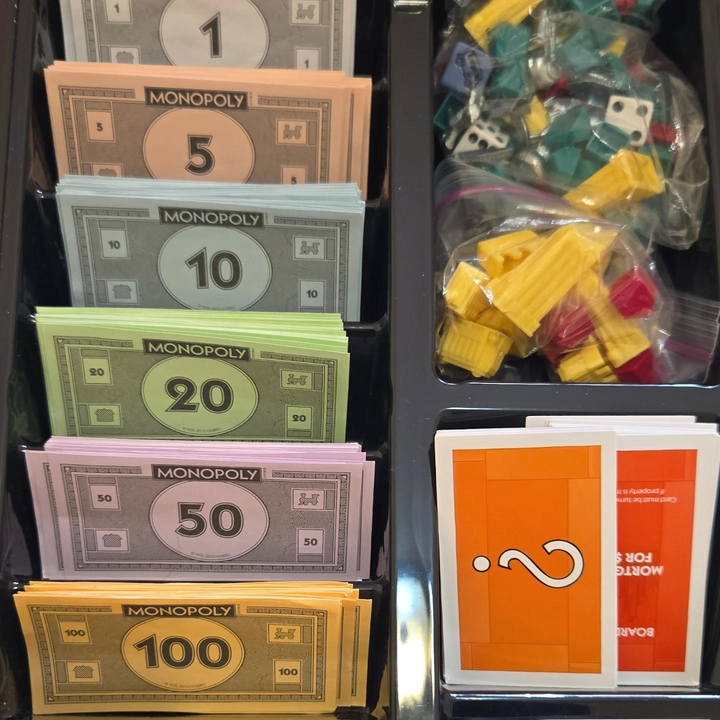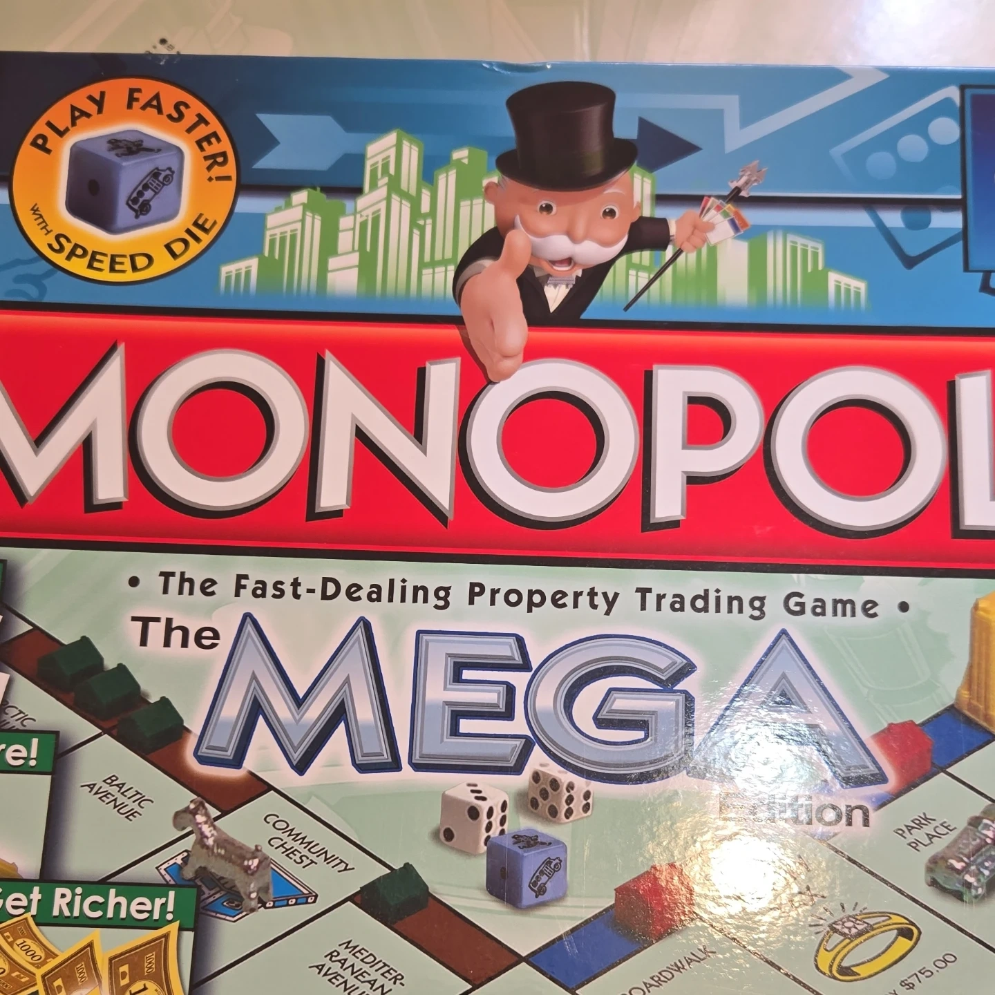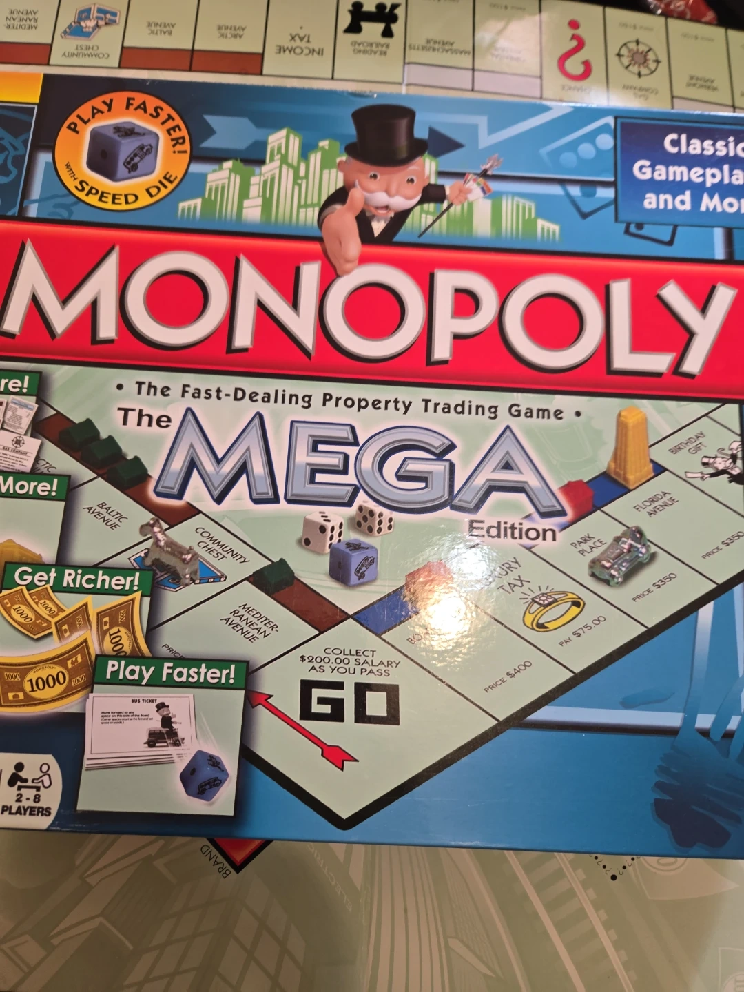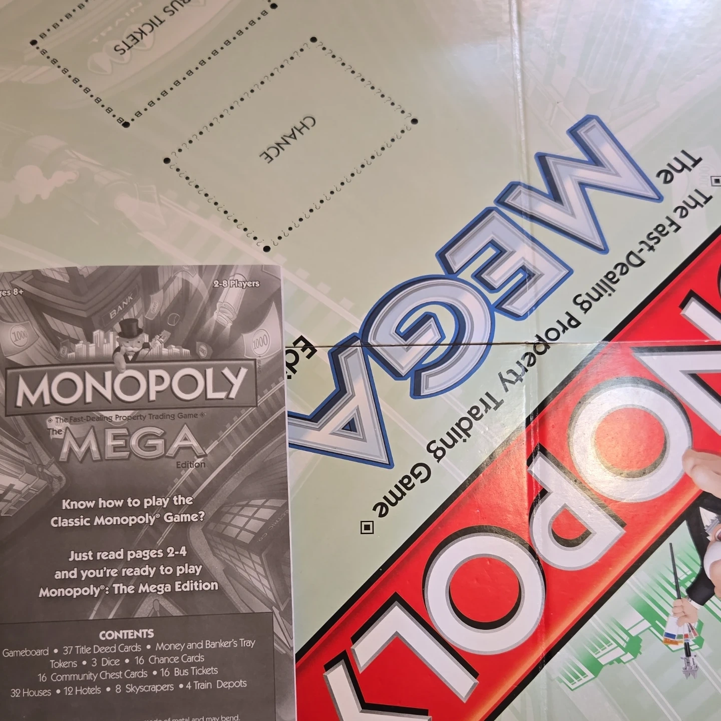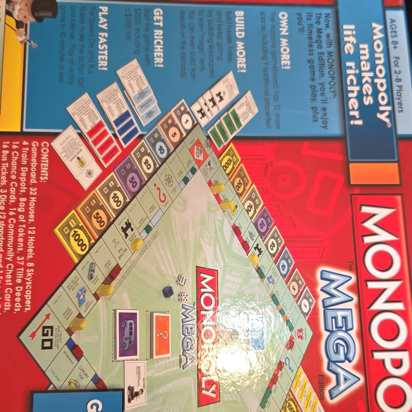 This is Monopoly The Mega Edition, a fast-dealing property trading game! It's for 2-8 players and includes a gameboard, 37 title deeds, money, banker's tray, tokens, community chest cards, chance cards, and bus tickets. Build houses and hotels to grow your empire!