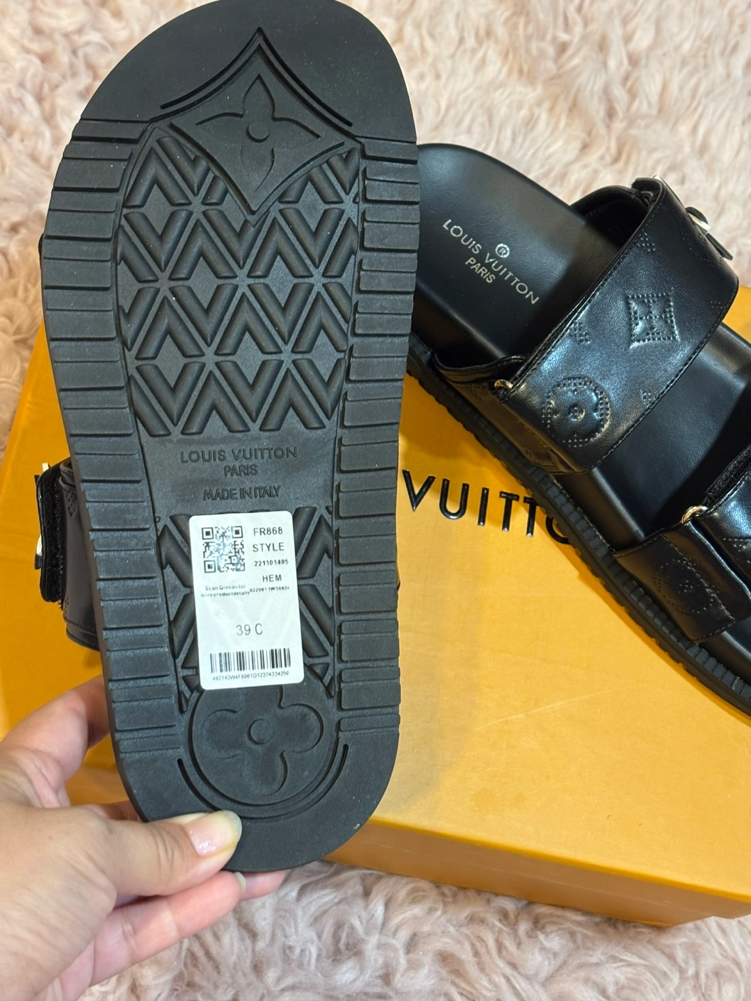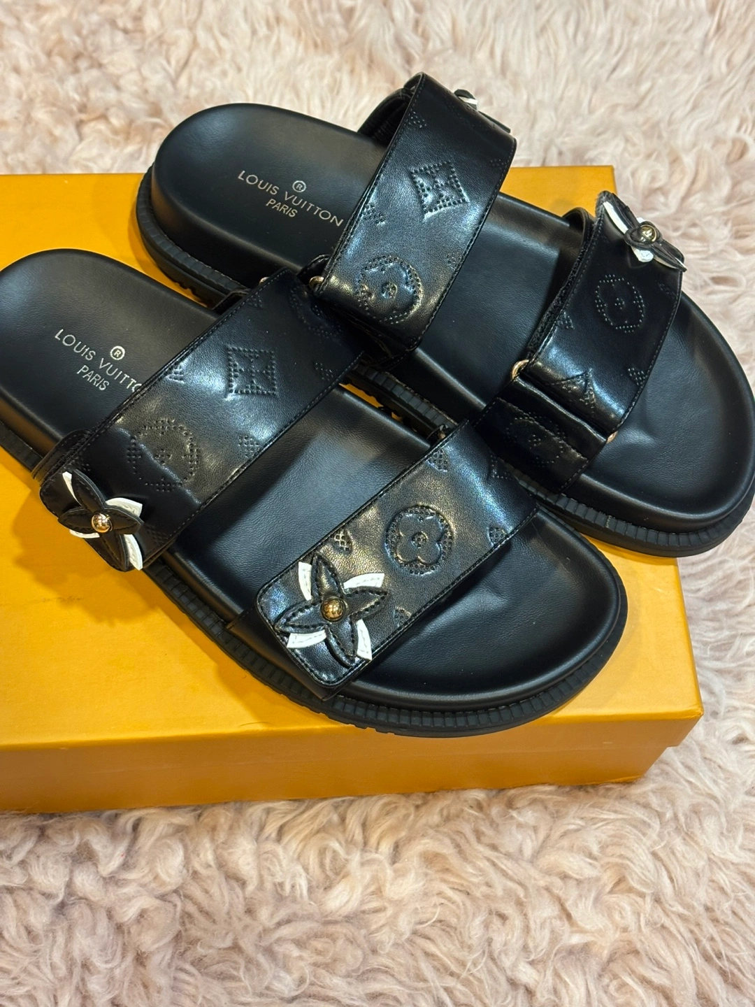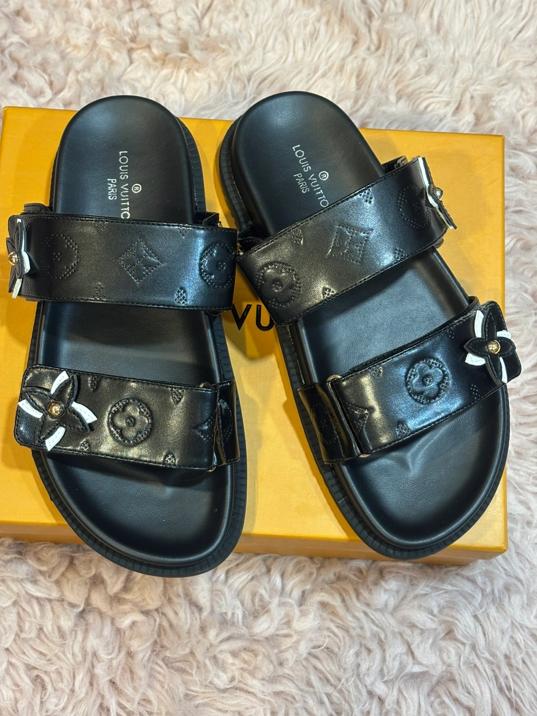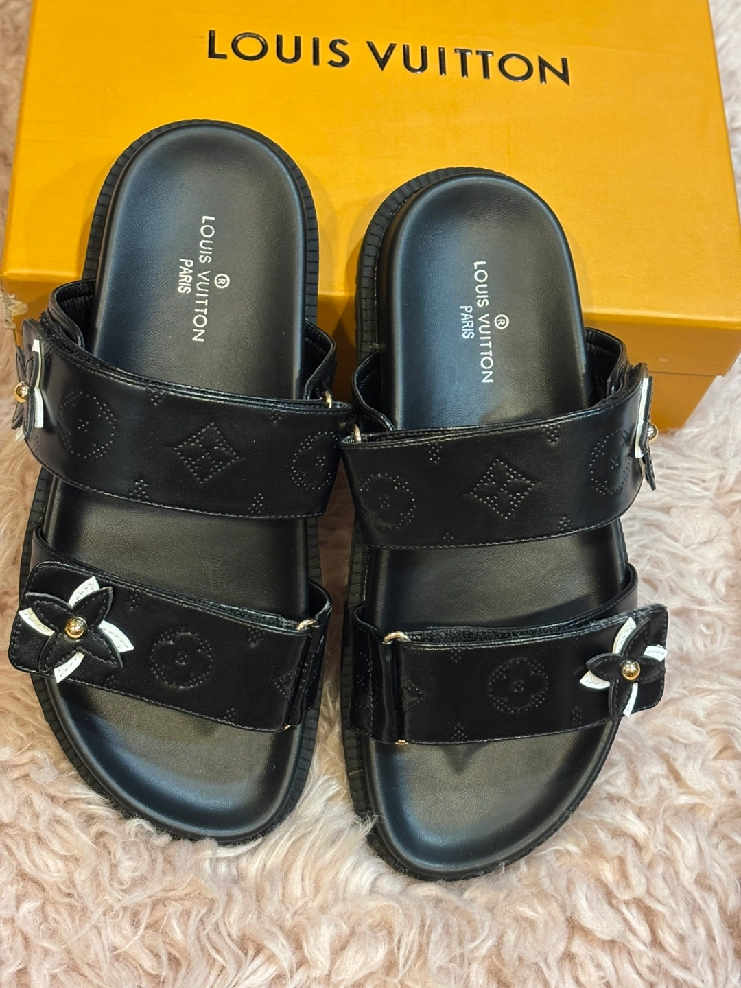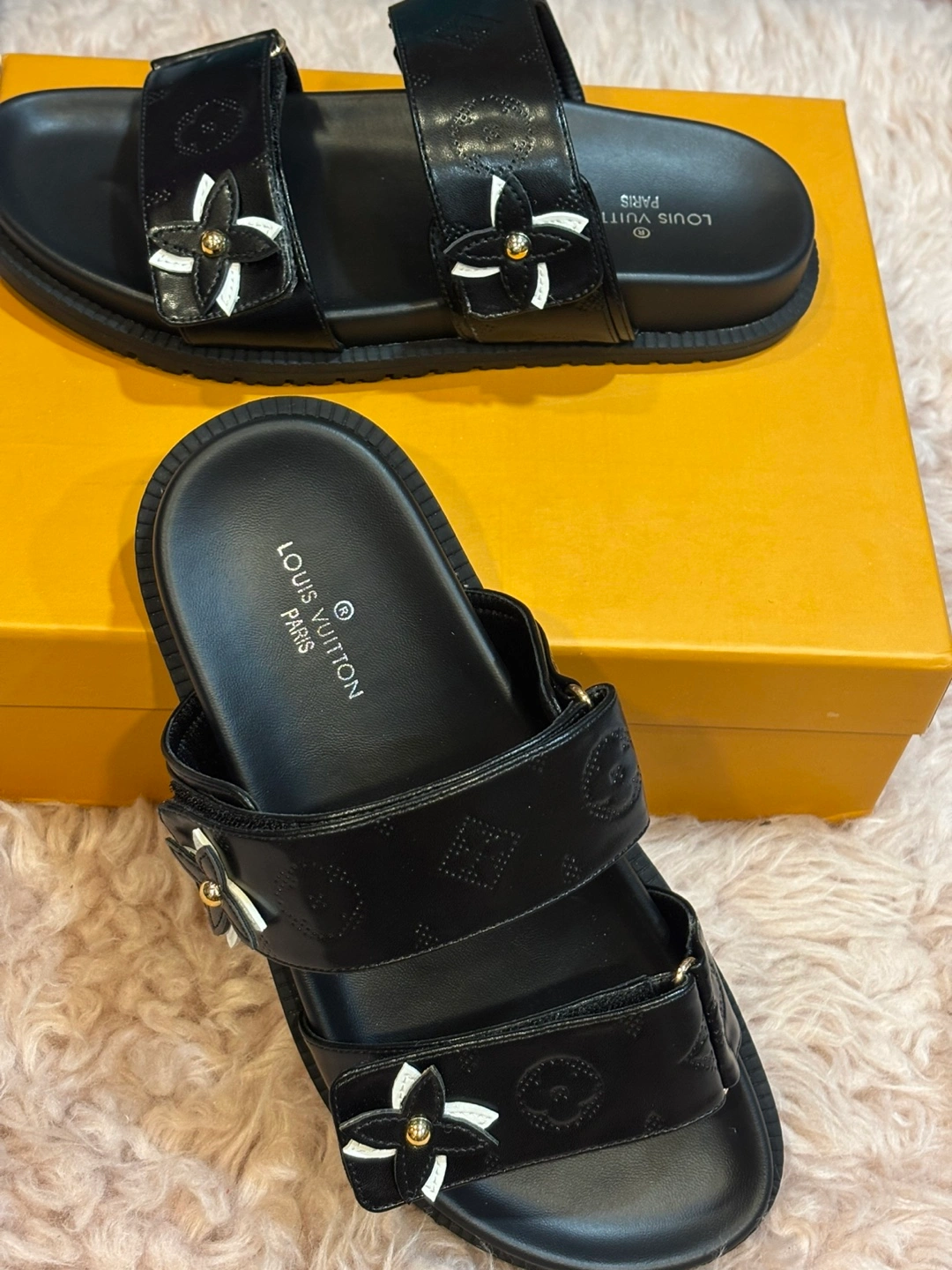 Louis Vuitton black sandals in size 8 They come with the original box. The sandals feature a double strap design with floral embellishments. Made in Italy