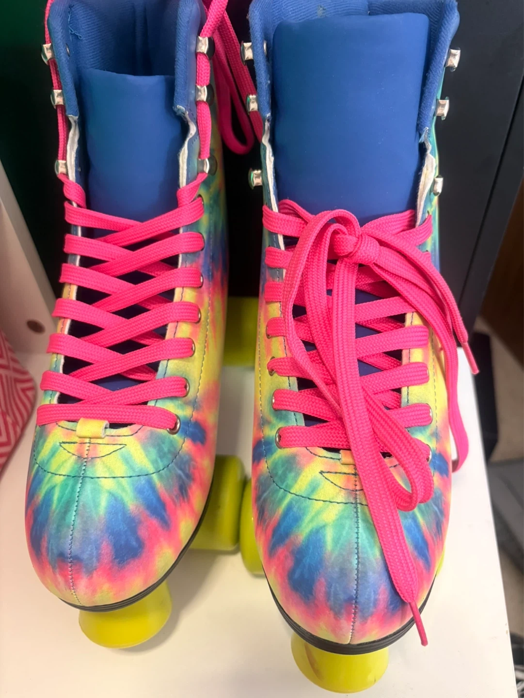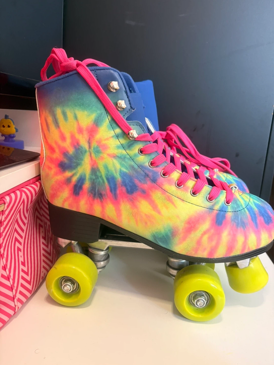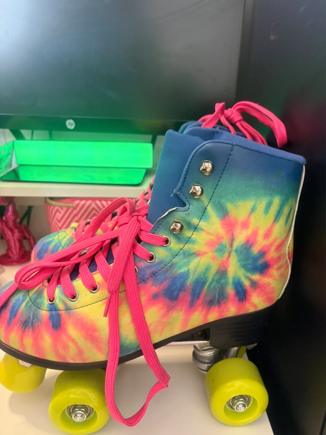 Awesome tie-dye roller skates with bright yellow wheels and pink laces! These skates have a vibrant, colorful design that's sure to turn heads. Ready for some fun on wheels!