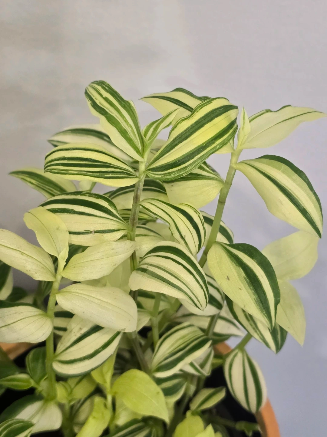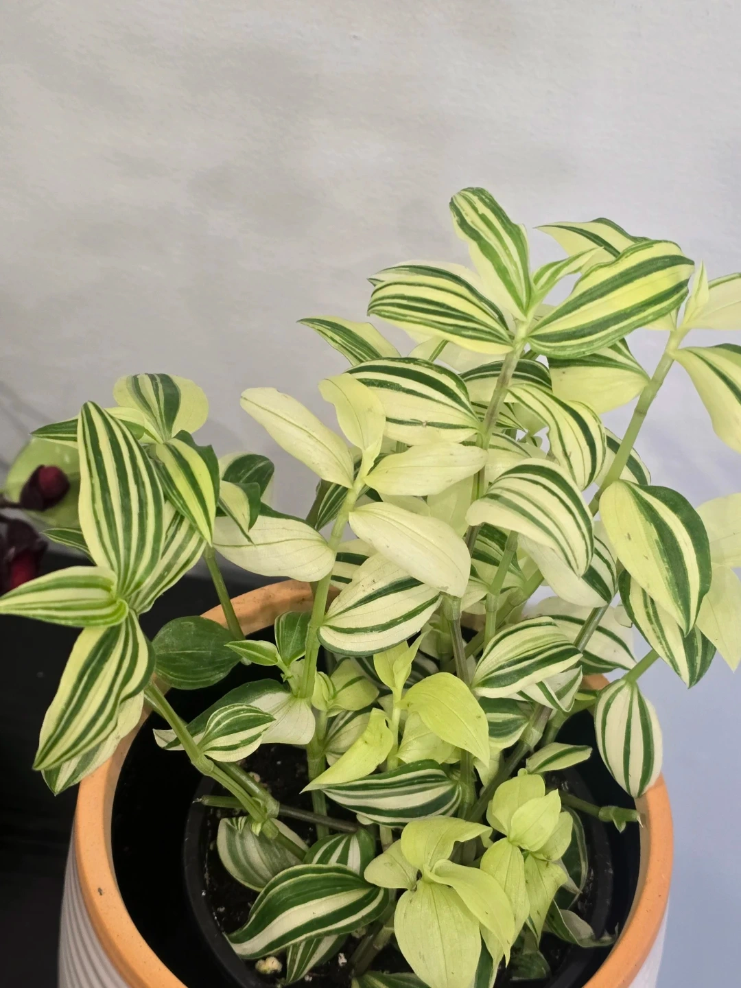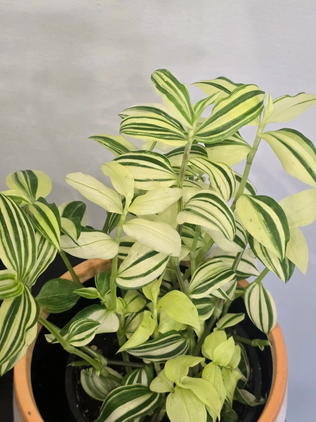A healthy variegated Tradescantia plant with striking green and white striped leaves. It's potted in a terracotta-coloured planter. This plant thrives in bright, indirect light. It's a lovely addition to any indoor space!