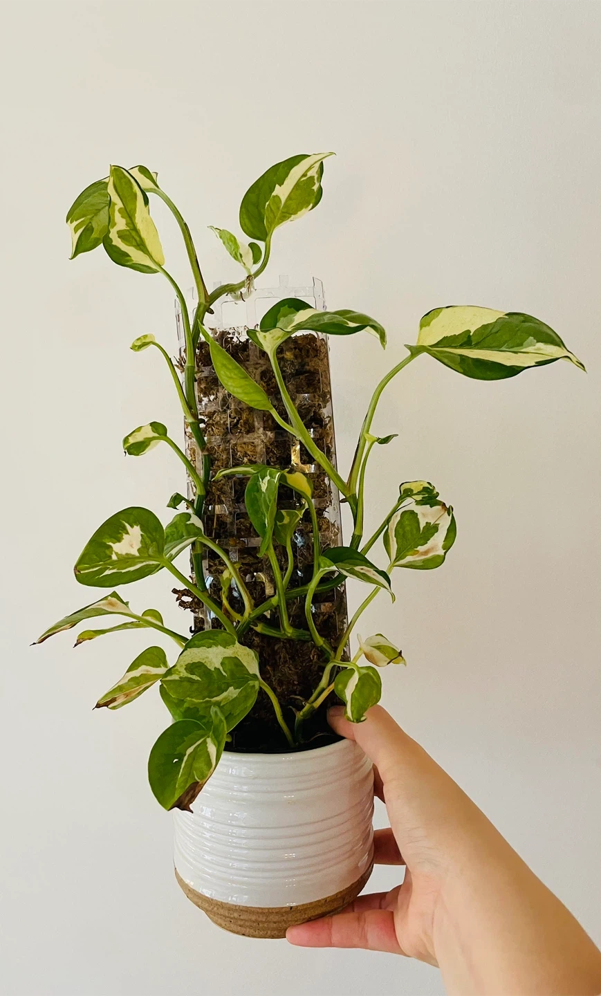 Beautiful Njoy Pothos featuring variegated green and white leaves. It's potted in a textured white planter and includes a moss pole for climbing. A lovely addition to any indoor space!