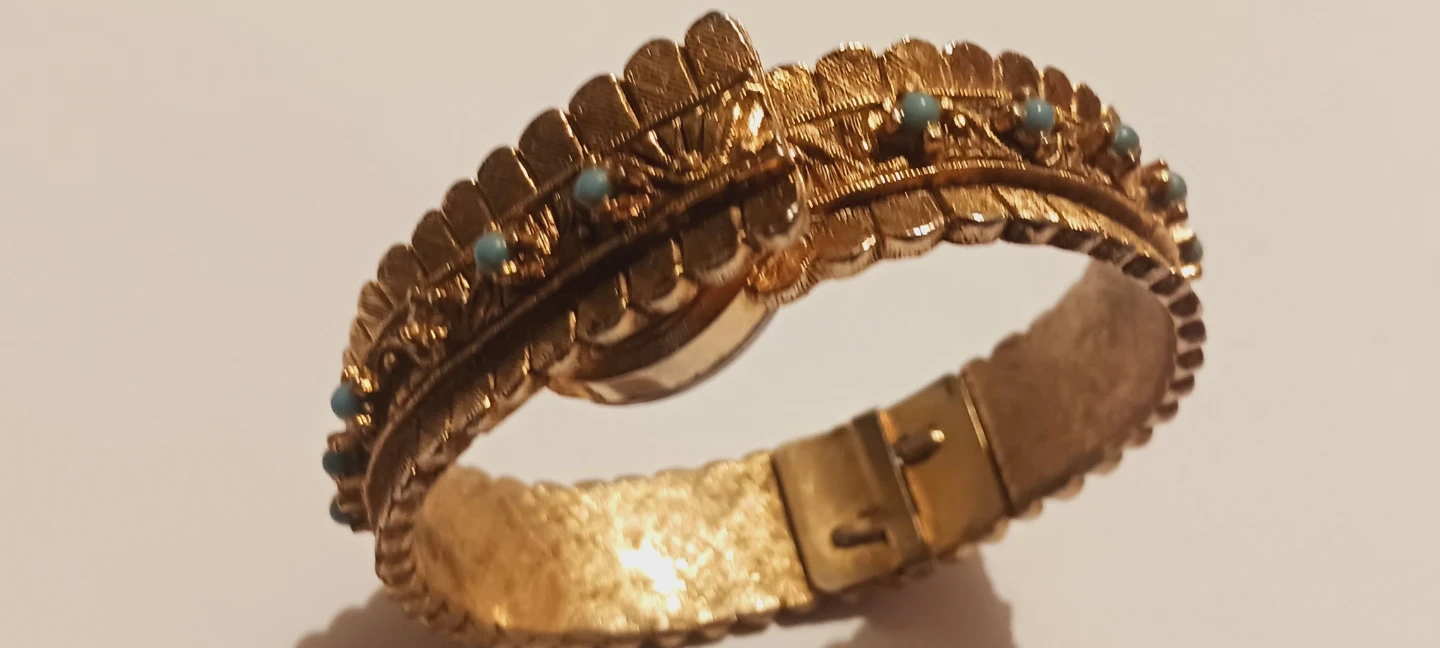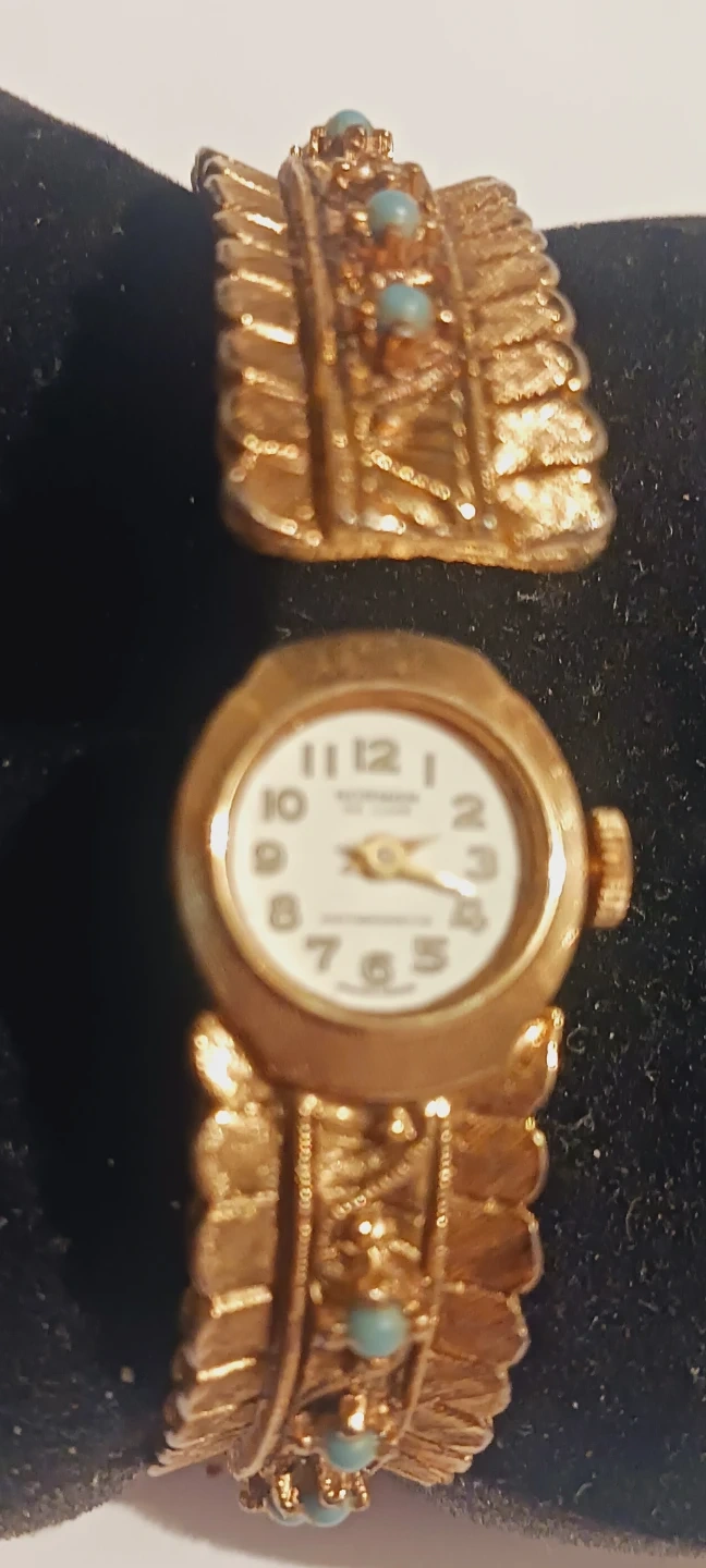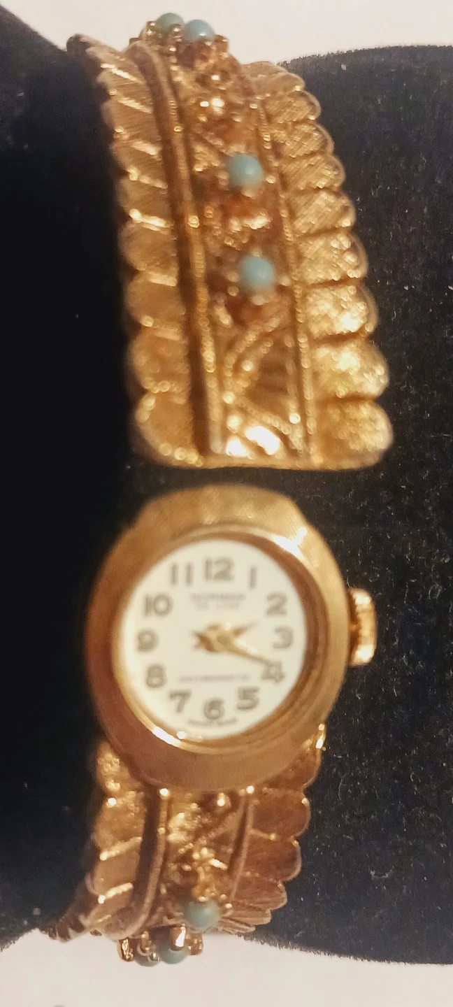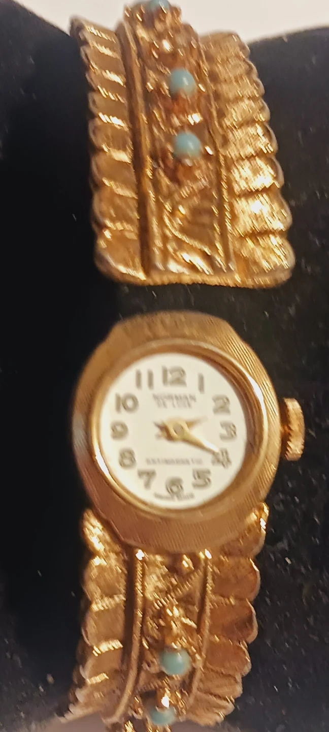 Gorgeous Vintage Retro Norman Deluxe Jeweled Swiss Made Bracelet Watch. Elegant vintage Norman Swiss bracelet/watchfeaturing a gold-tone bracelet. Intricate detailing and small turquoise stones adorn the band. The watch face has clear hour markers. ALL MY PRICES ARE NEGOTIABLE !!