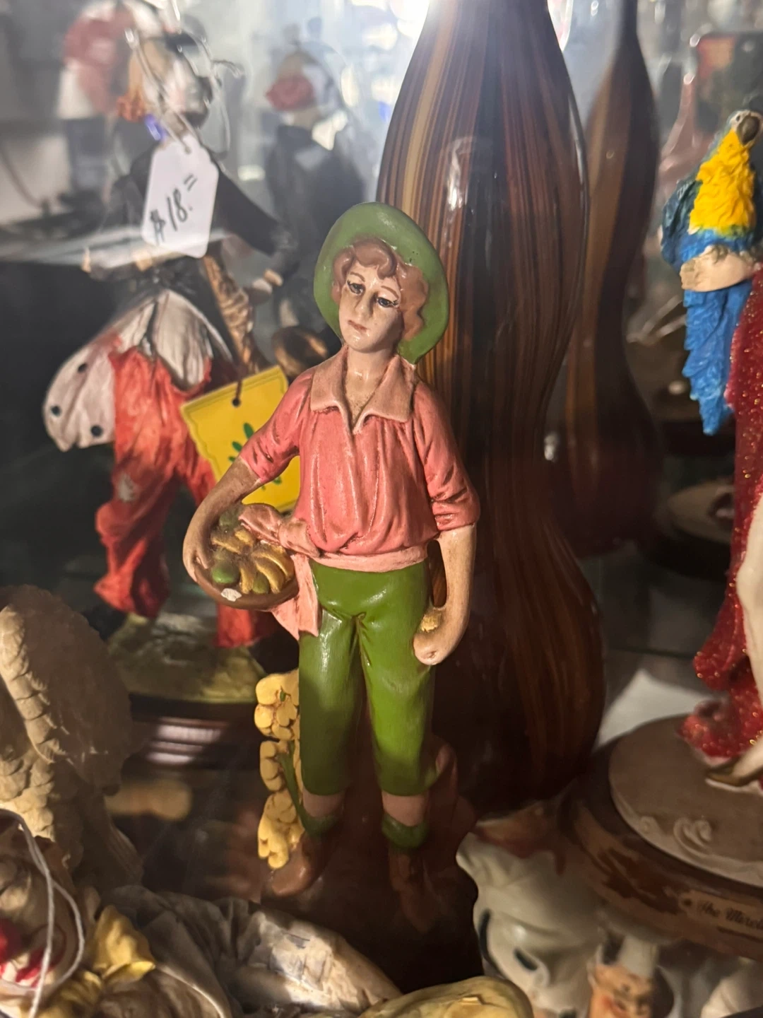 This is a decorative figurine of a young boy wearing a green hat and a pink shirt, holding a basket filled with fruit. He's dressed in green pants. It's a charming piece for display!