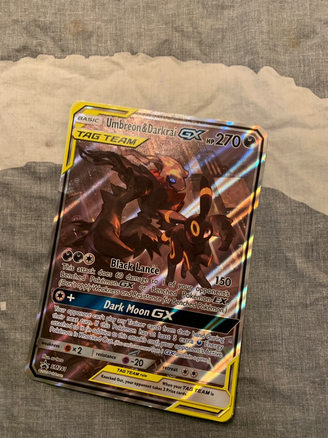 Selling an Umbreon & Darkrai GX Tag Team Pokemon card! It has 270 HP and features the Black Lance and Dark Moon GX attacks slight bent