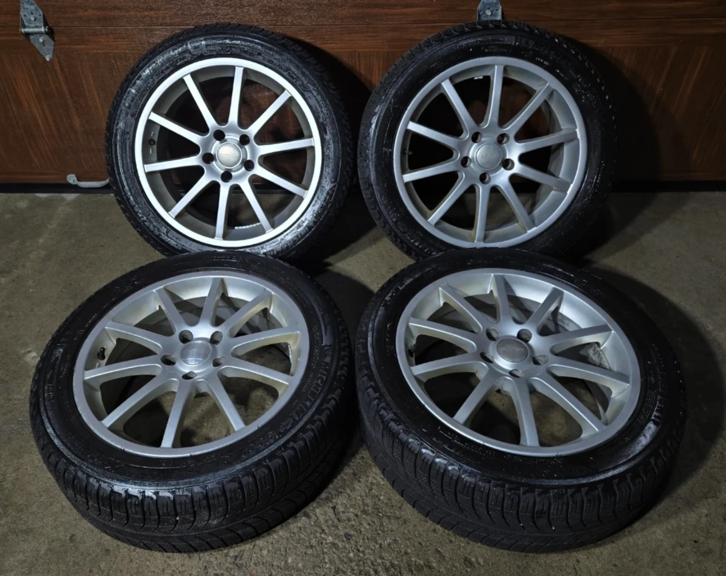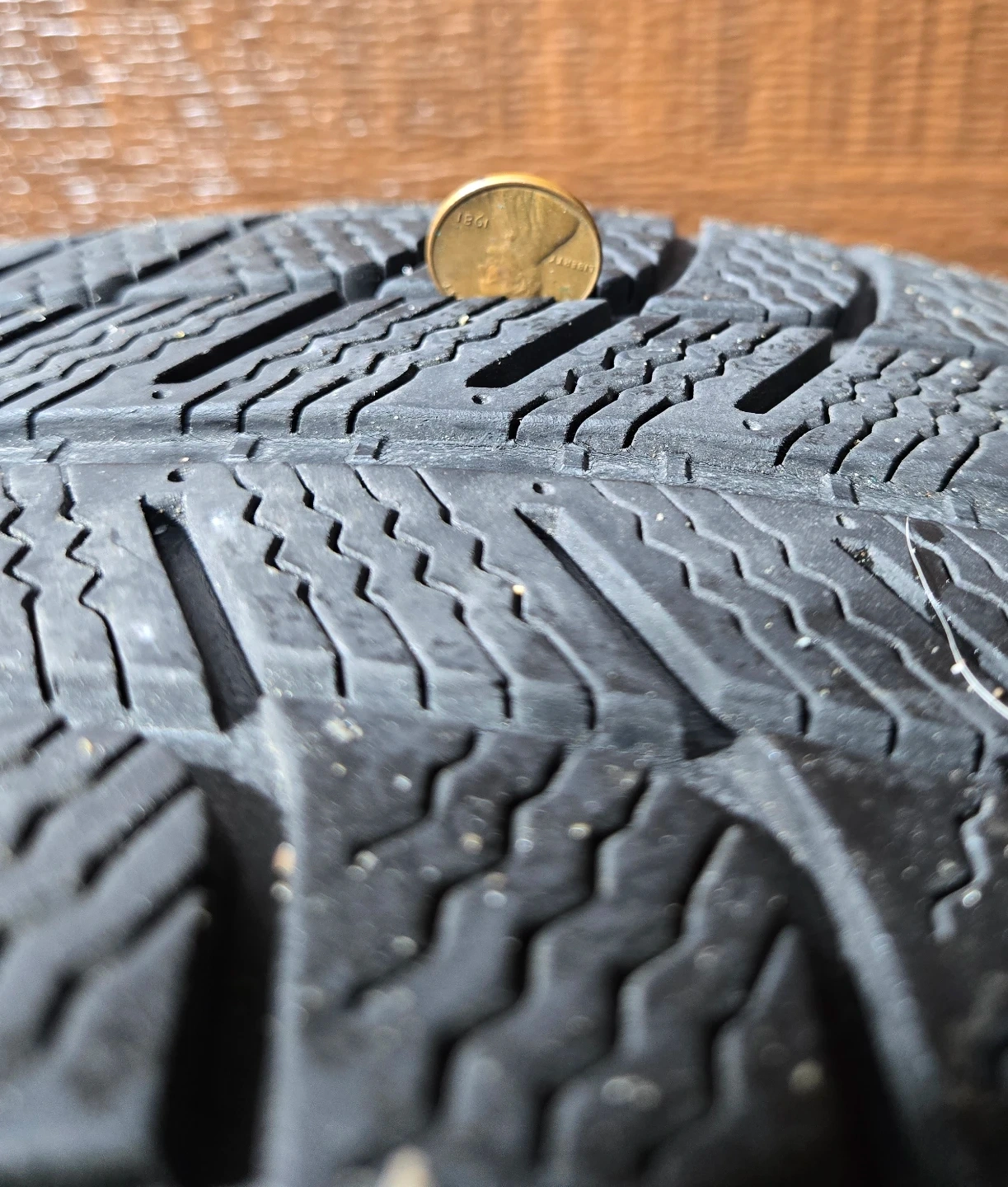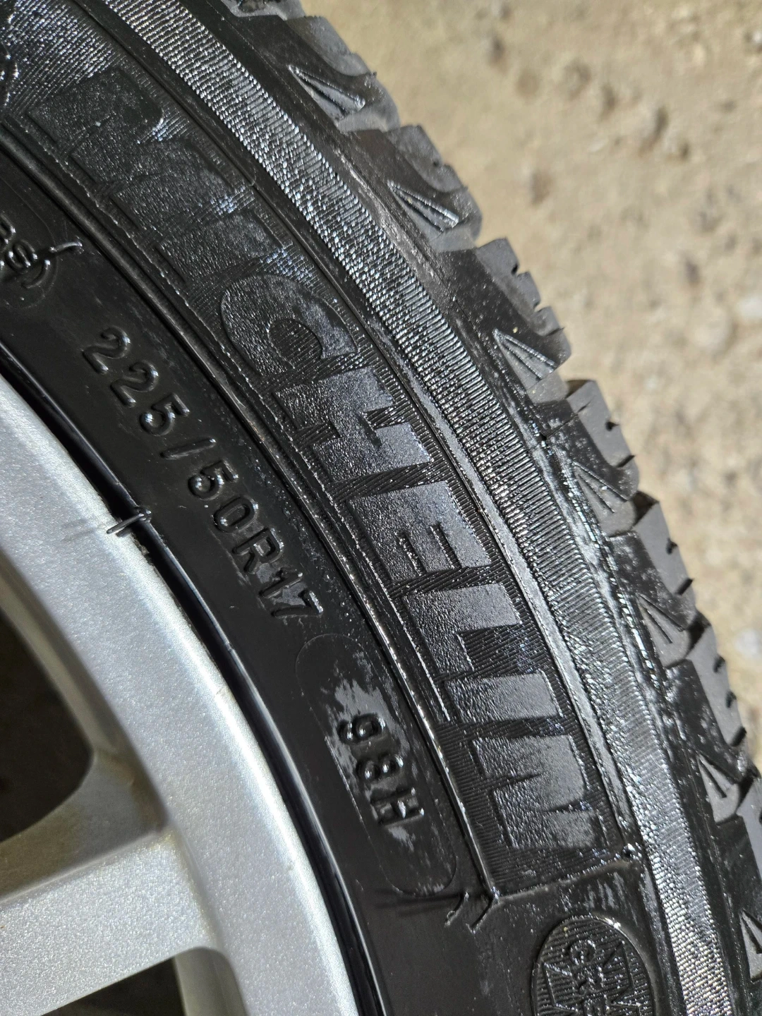 Set of 4 Michelin winter tires (225x50xR17) mounted on RSSW silver alloy rims in good condition. One rim has minor curb rash.