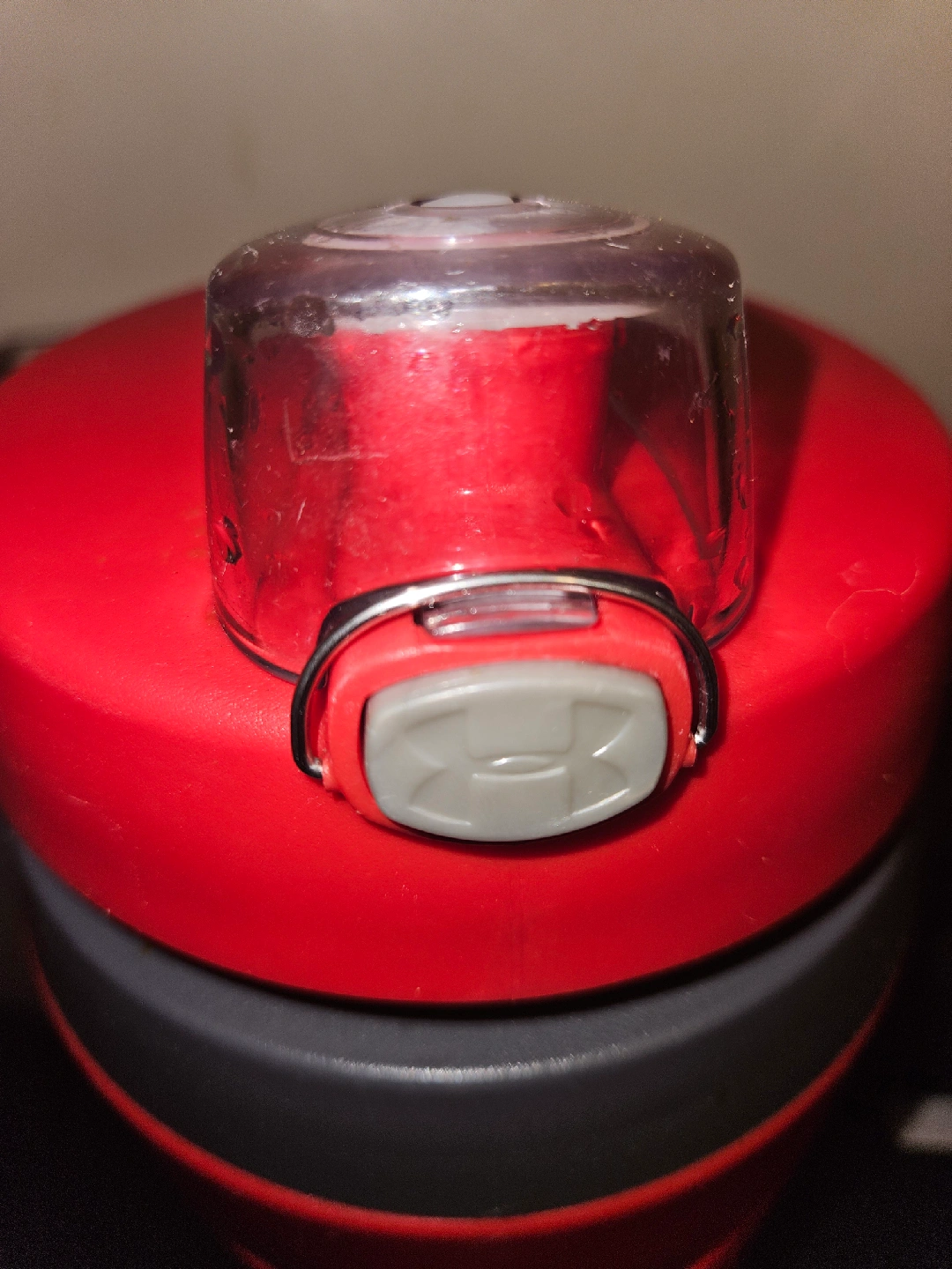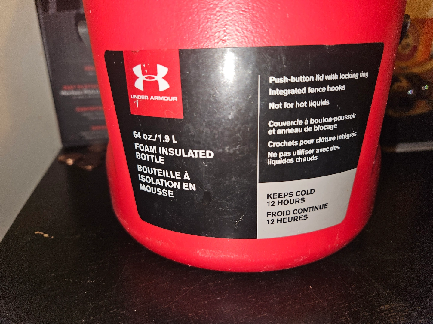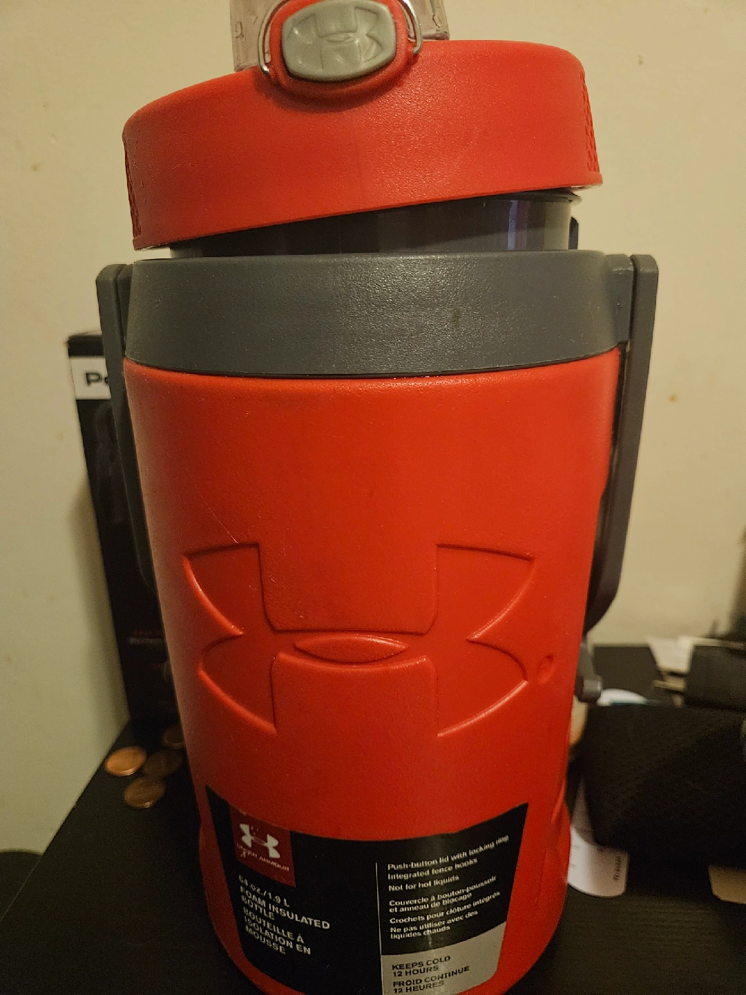 This is a red Under Armour foam insulated bottle. It holds 64 oz/1.9 L and keeps cold for 12 hours. It has a push-button lid with locking ring and integrated fence hooks. Great for staying hydrated!