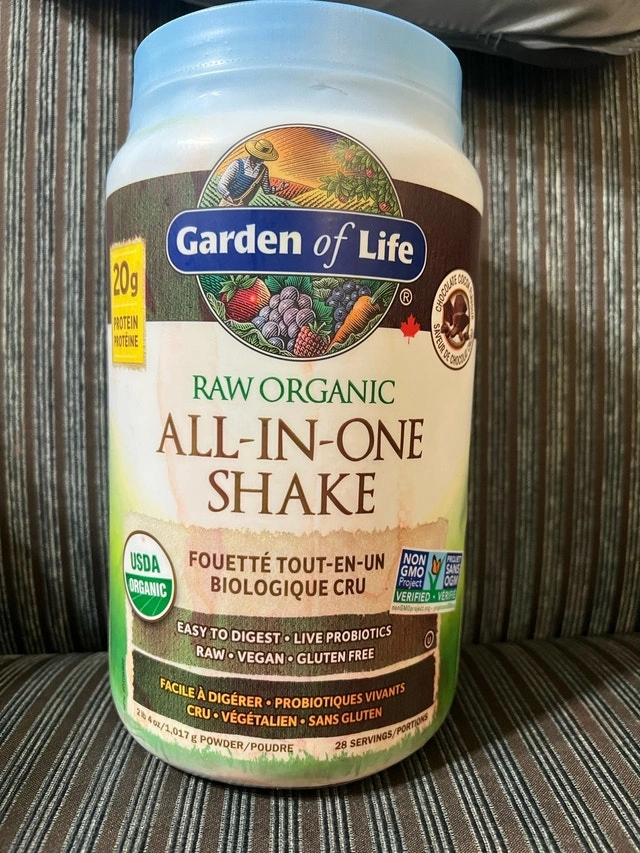 I'm selling a container of Garden of Life Raw Organic All-In-One Shake in chocolate flavour. This shake offers 20g of protein per serving and is a convenient way to boost your daily nutrition. It's sealed and brand new, perfect for anyone looking to try a high-quality organic protein shake. Features include: 20g of protein per serving, raw and organic ingredients, all-in-one nutritional support, chocolate flavour, and 28 servings per container. Pricing this competitively. If you're seeing this ad, the shake is still available and ready to go!