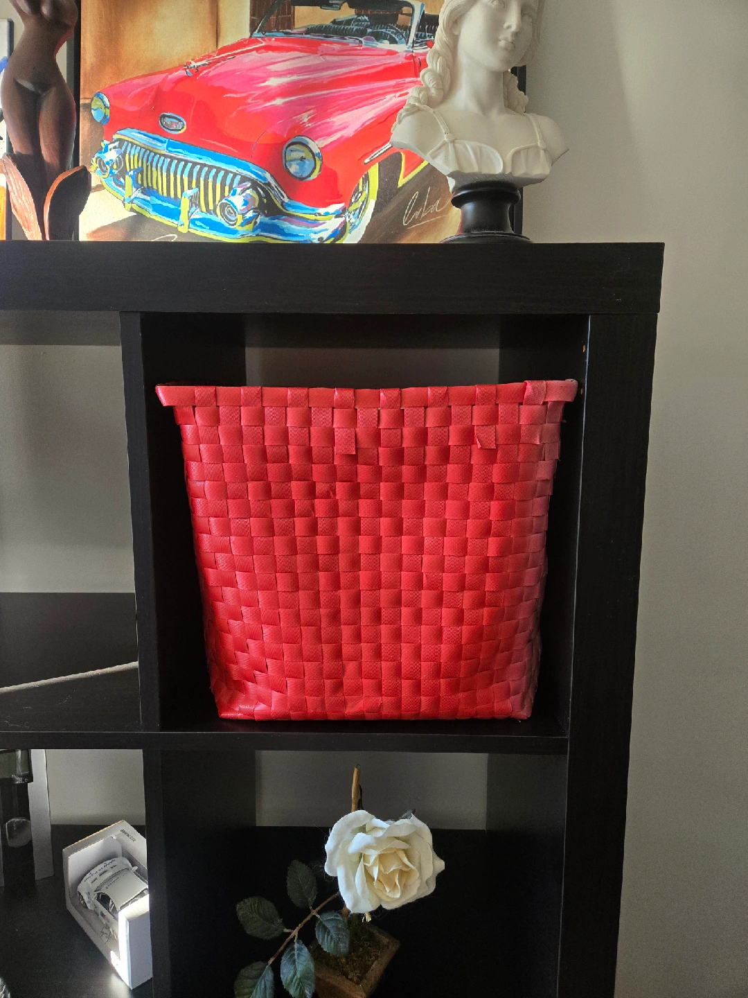 Here's a red woven storage basket, perfect for organizing your space! It's in great condition and ready to hold your items. The basket is made of a durable material and has a nice woven texture. It's a great size for shelves or countertops!