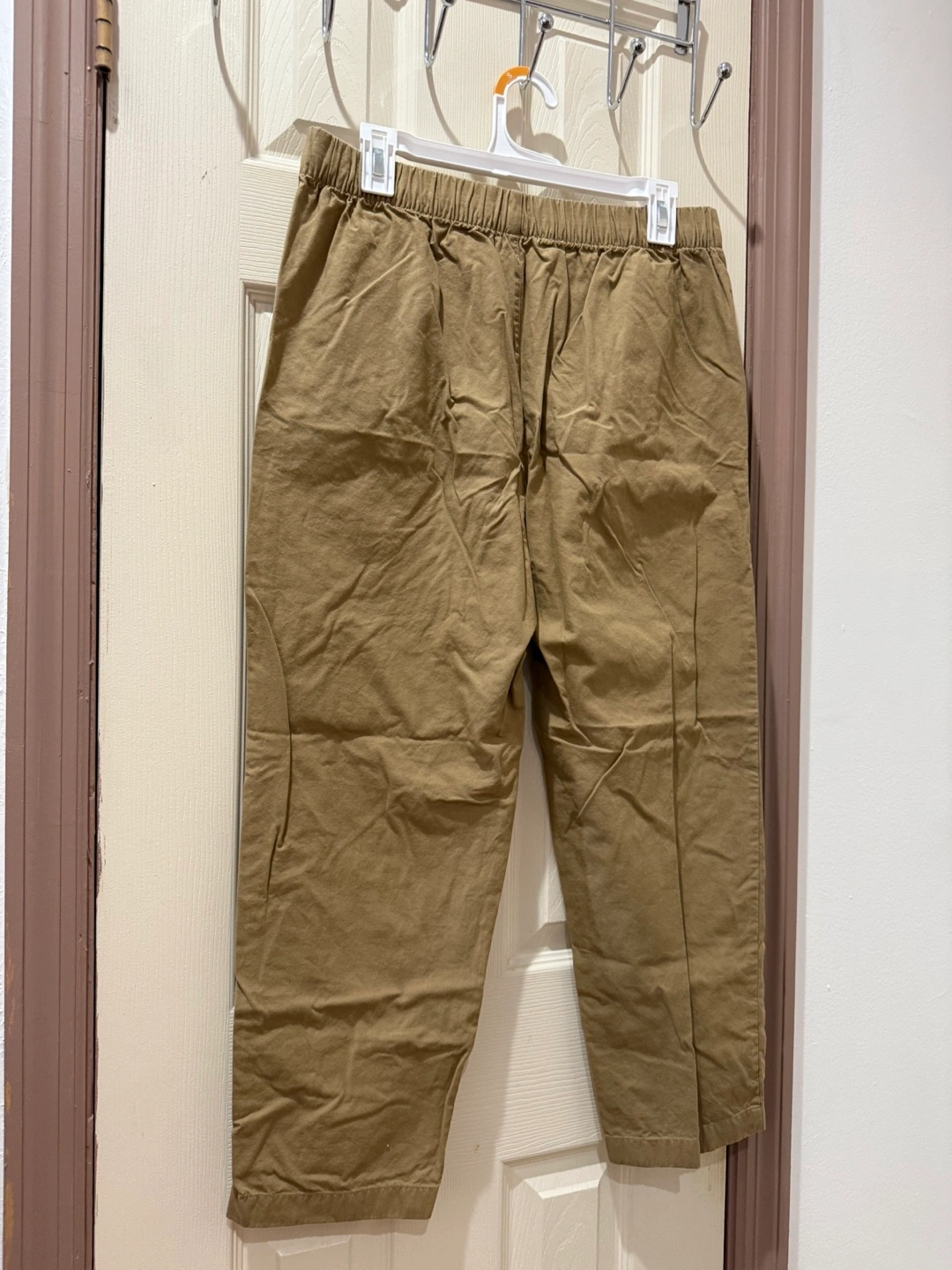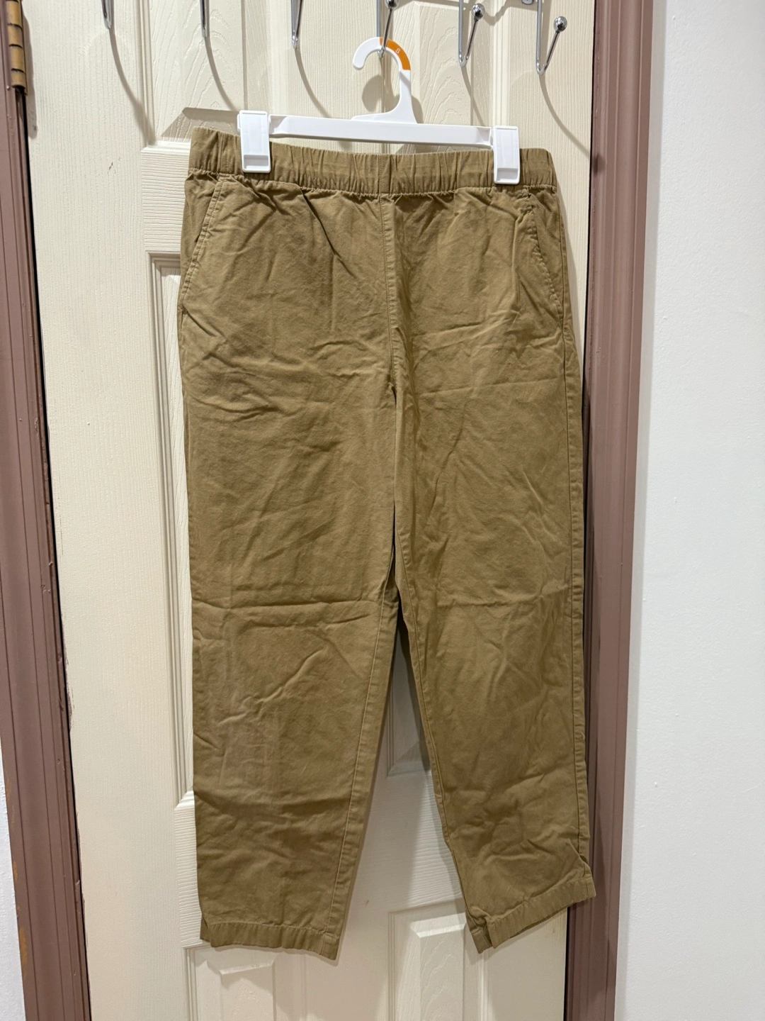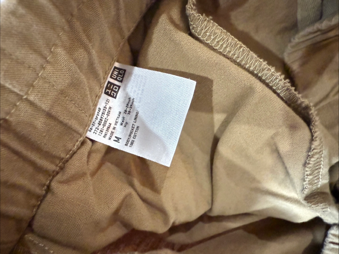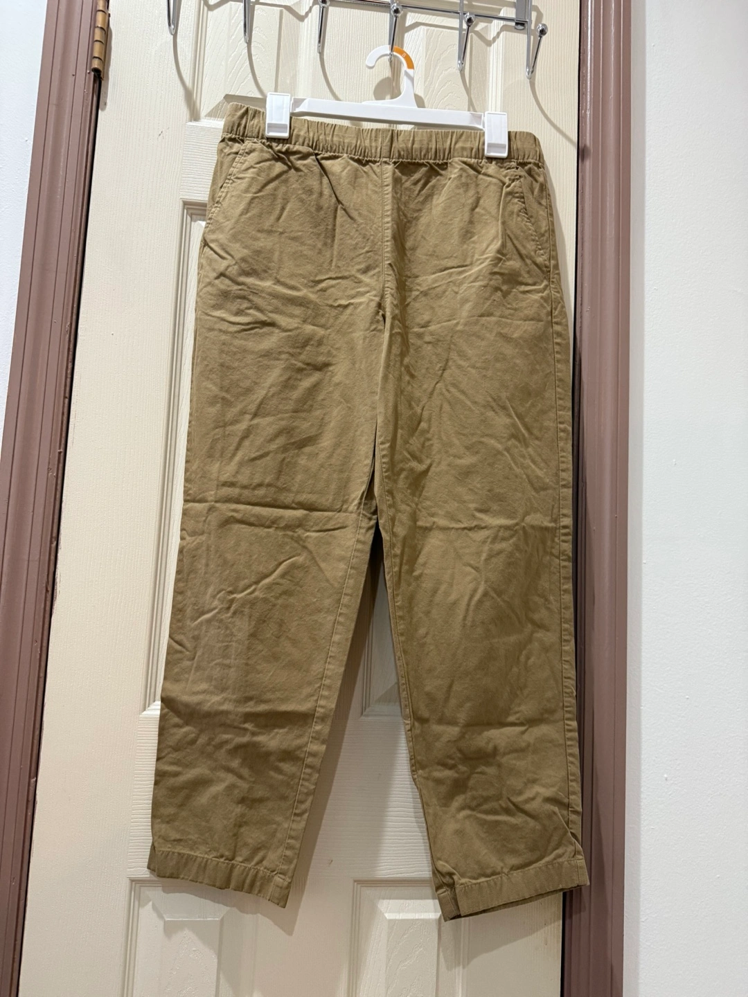 These are a pair of Uniqlo cropped pants in a neutral beige color. They're a size M with a waist of 28-31 inches and hips of 36-39 inches. The pants are made of 100% cotton