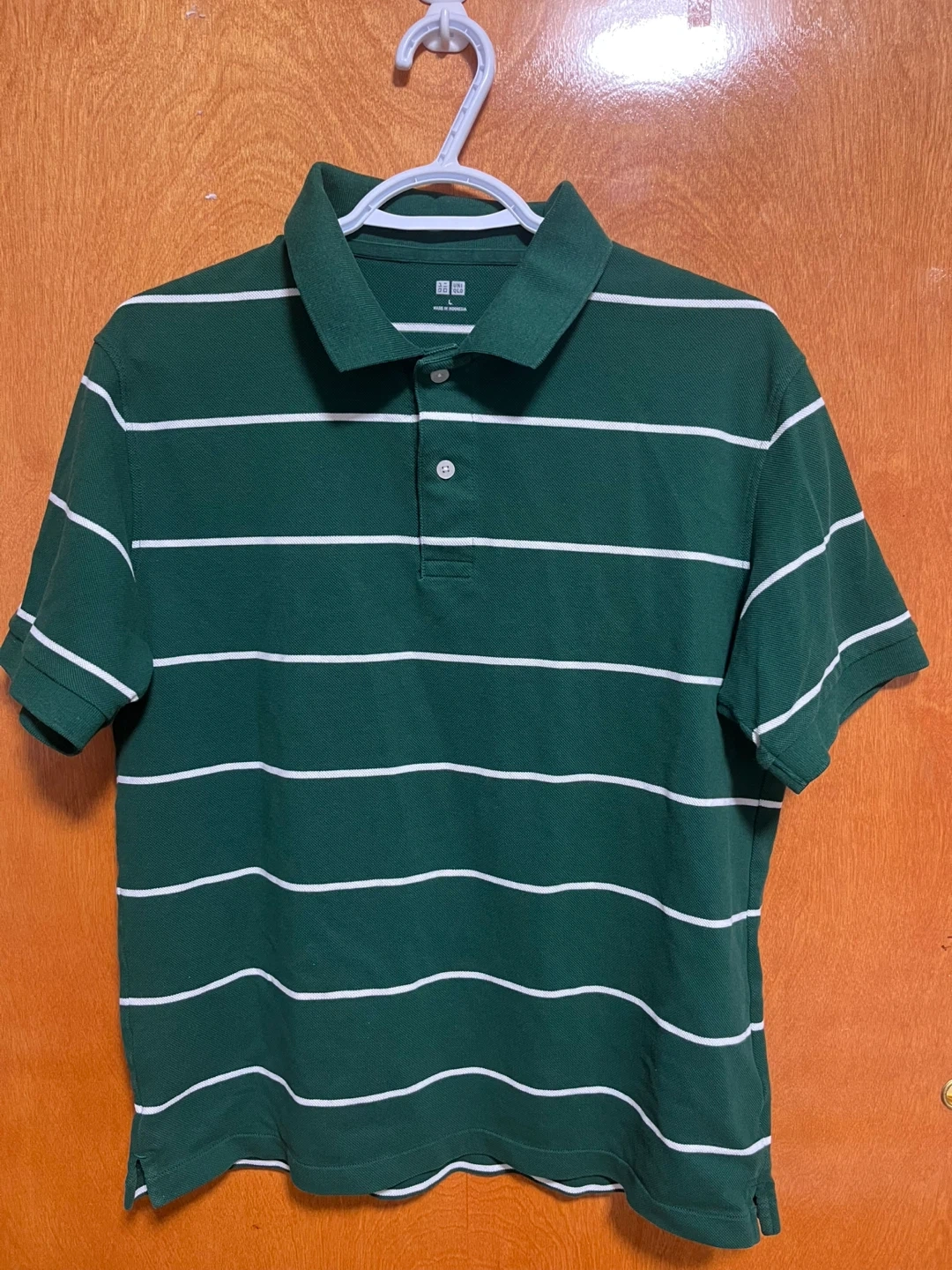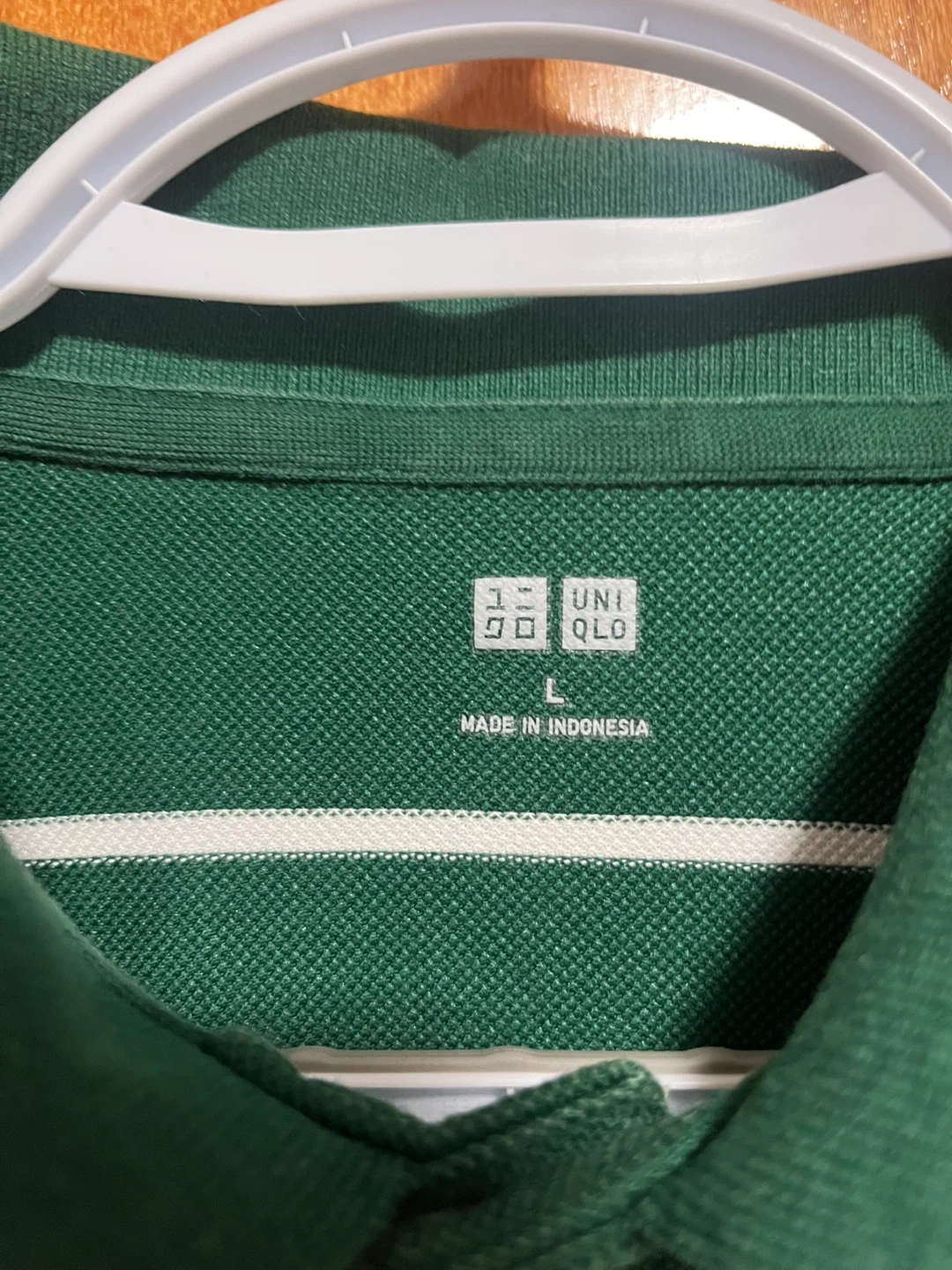 600Selling a Uniqlo polo shirt in green with white stripes! It's a size L and made in Indonesia. Perfect for a casual look!