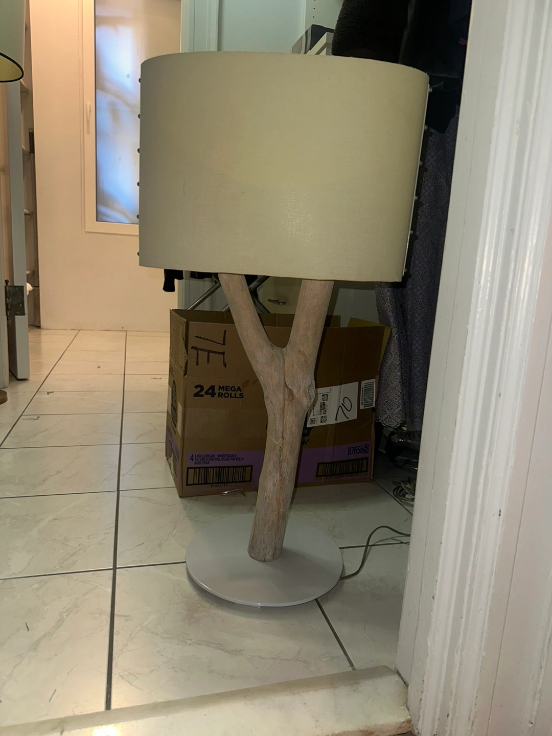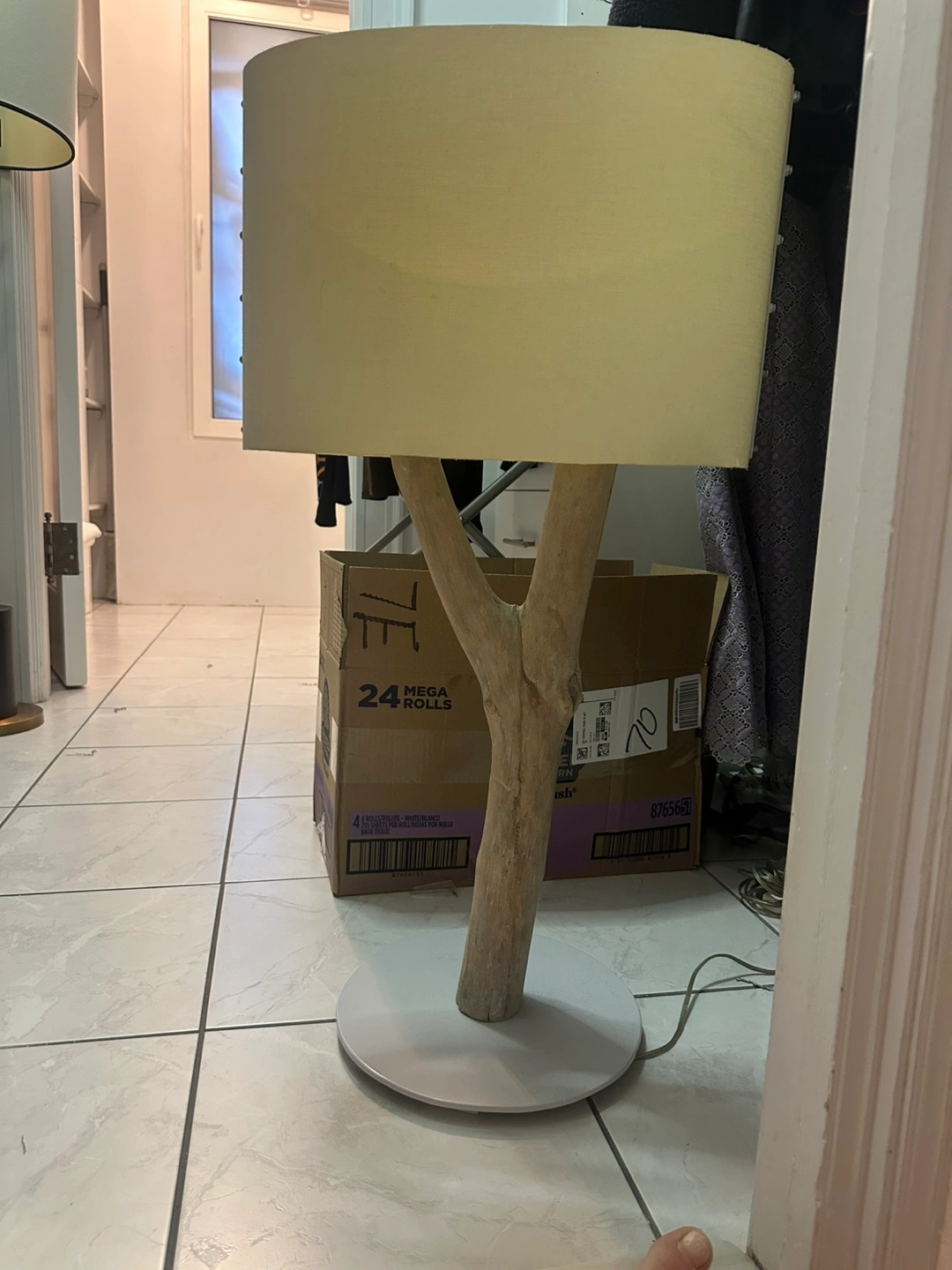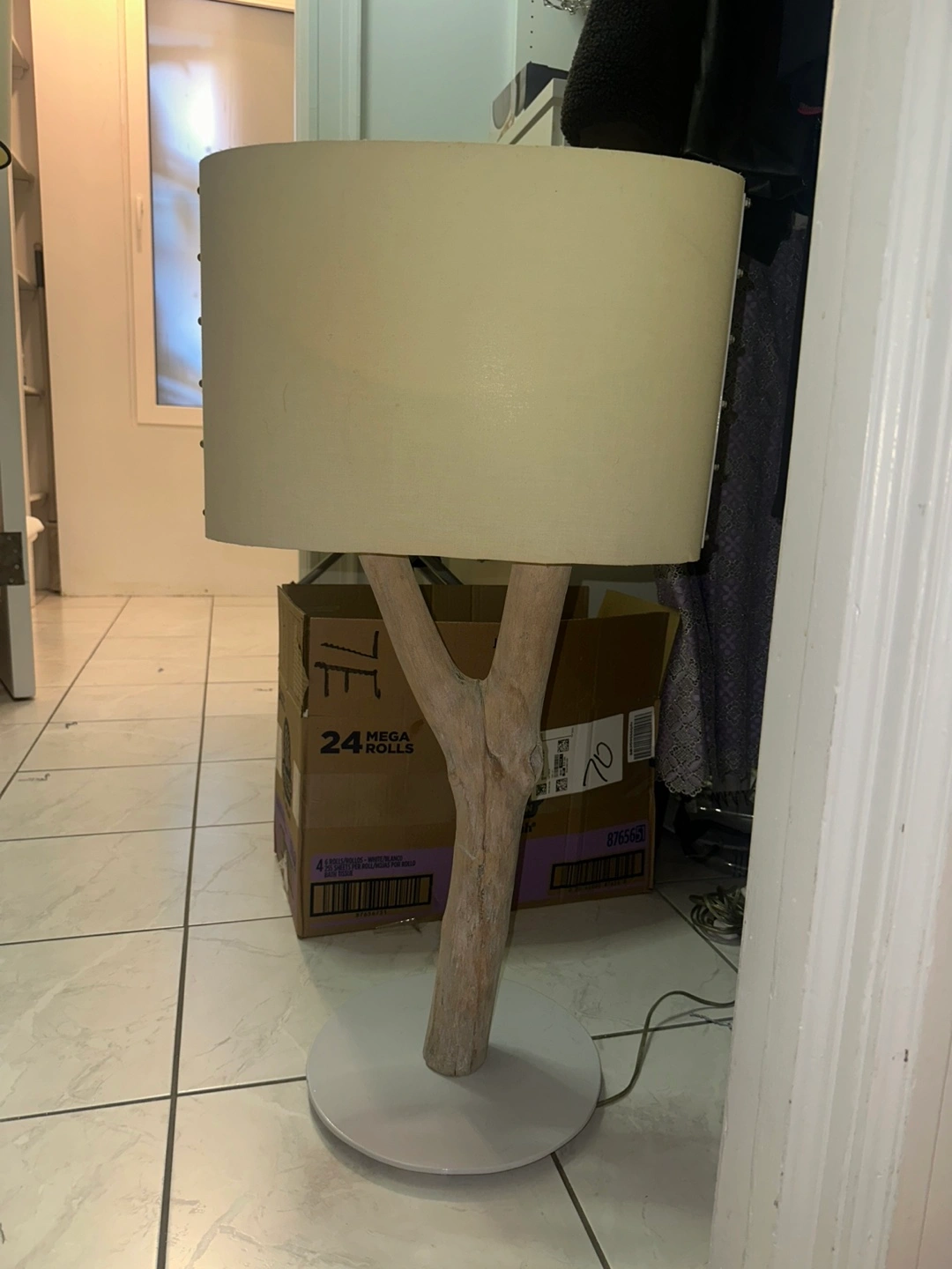 This is a unique table lamp with a tree trunk base and a cream-colored shade. It's a great statement piece for any room and adds a touch of nature to your home decor. It's in great condition and ready to brighten up your space!