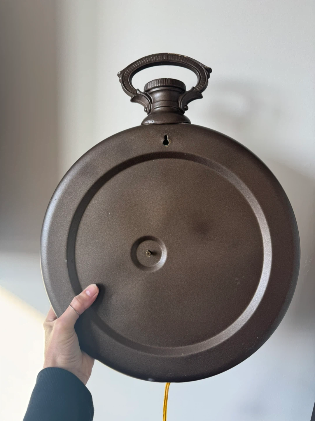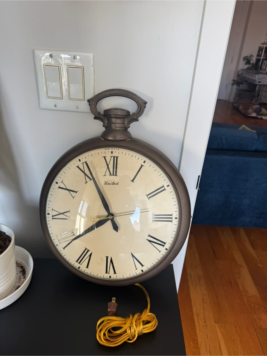 Selling a United pocket watch-style wall clock. It's a unique and stylish piece that would look great in any room. The clock has a bronze finish and a classic design. It's in good condition and keeps accurate time! 17” tall 14” across