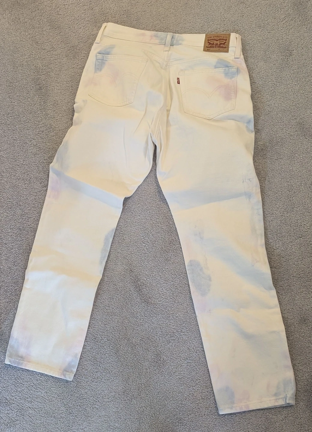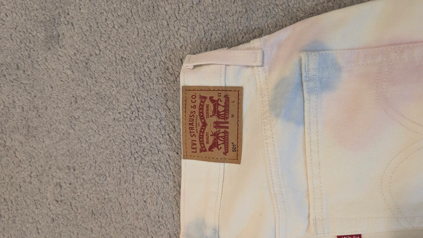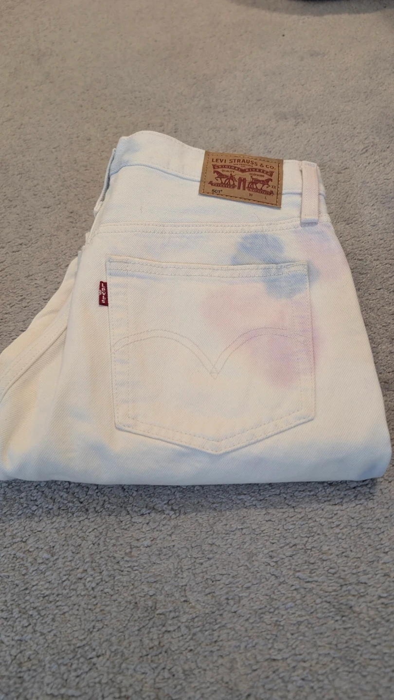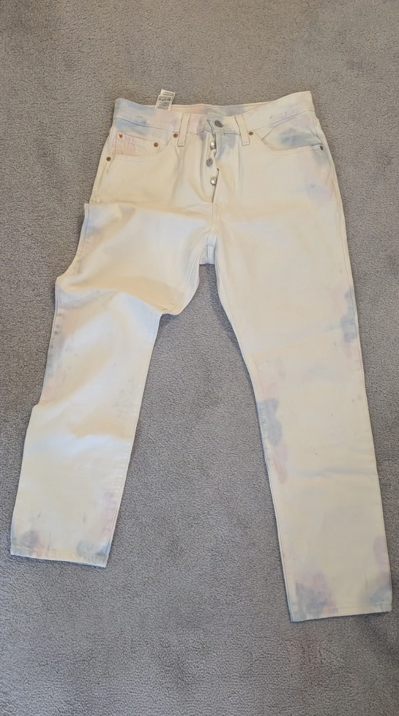 Classic white Levi's 501 jeans with a subtle pink and blue tie-dye pattern. Button fly closure. Cotton denim.