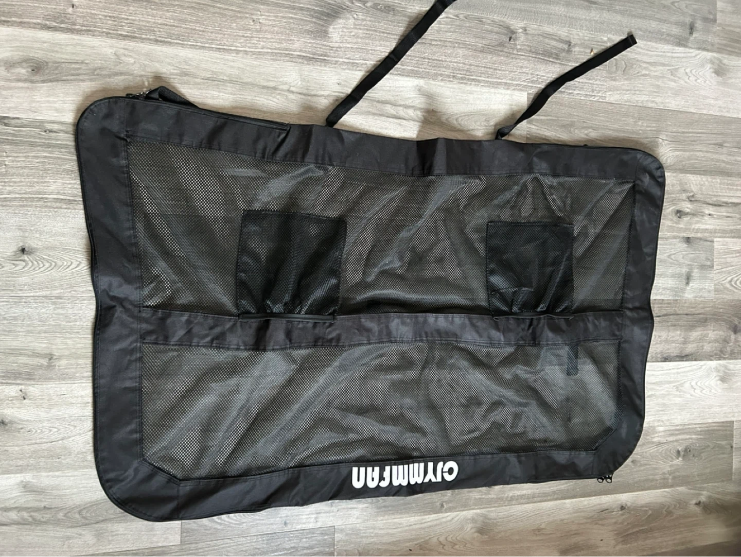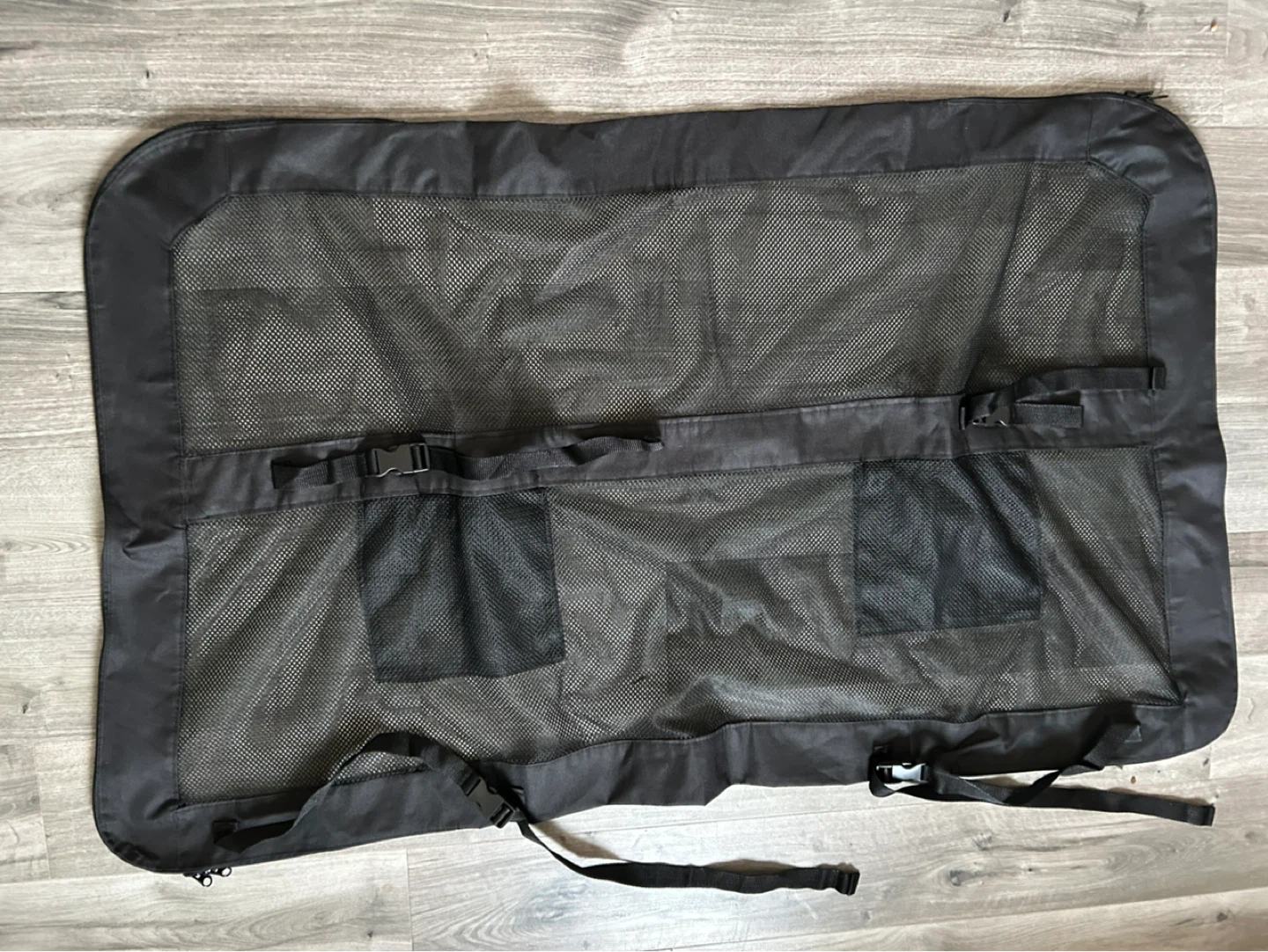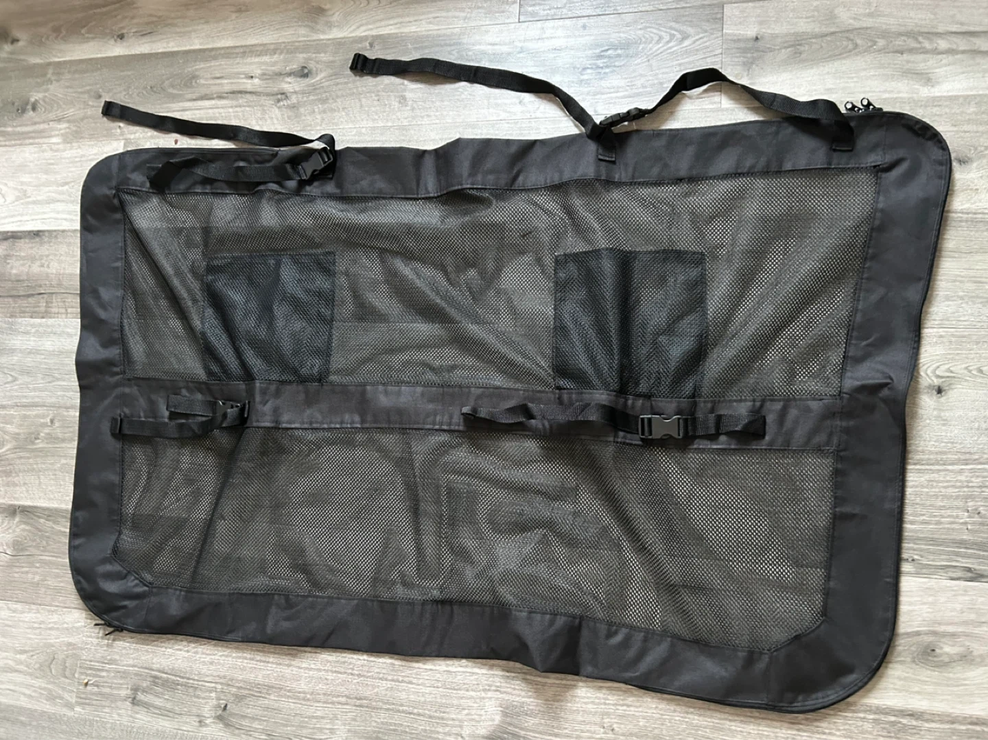 The item shown is a CJYMMFAN branded organizer panel, likely designed to fit inside the lid of a hard protective case to provide additional mesh pocket storage. It features multiple pockets for storage and adjustable straps for secure attachment. Keep your car tidy and your essentials within reach!