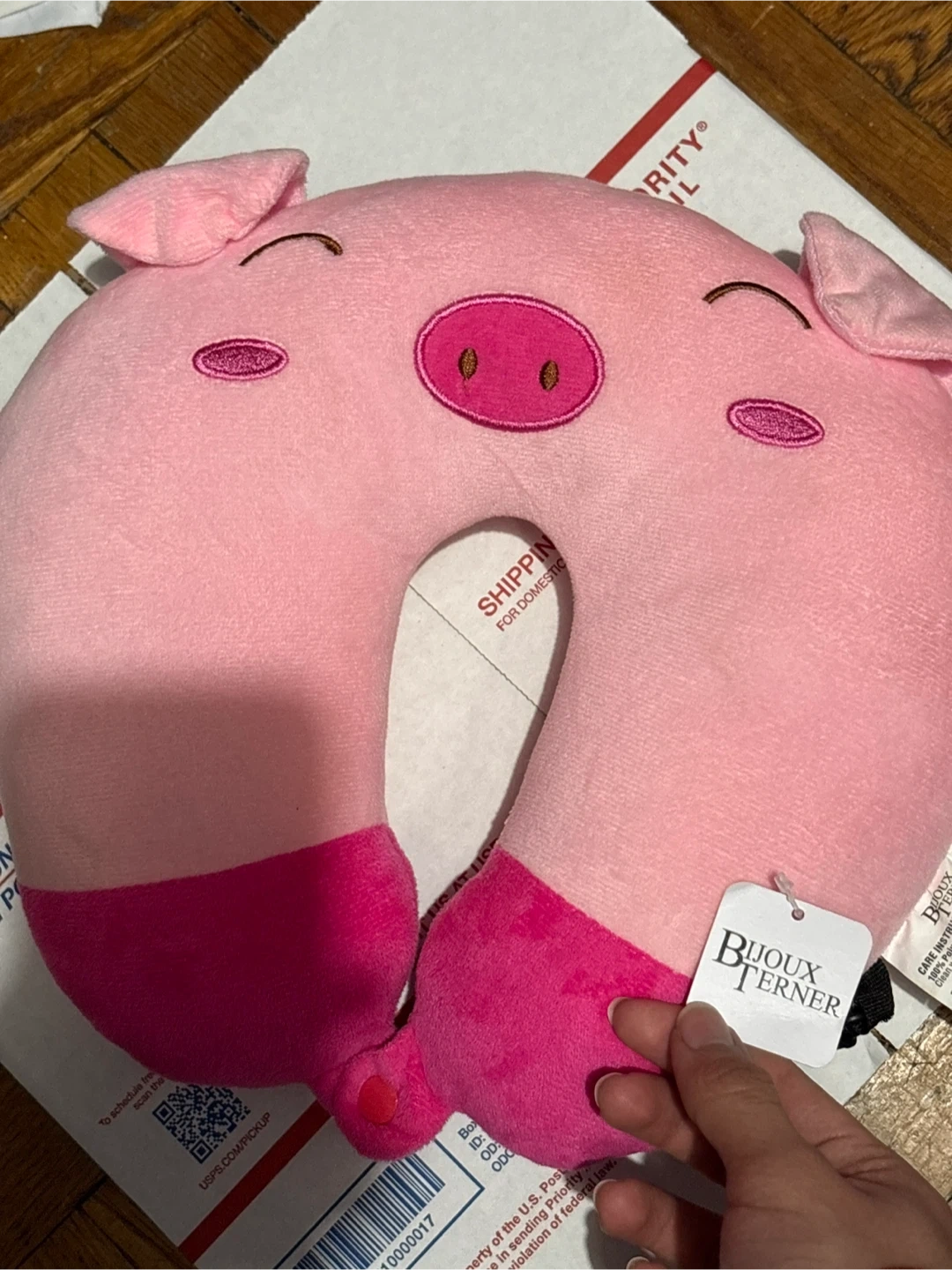 This is a cute pink pig-shaped travel pillow. It's made from 100% polyester for a soft feel. Great for making car rides or flights more comfortable!