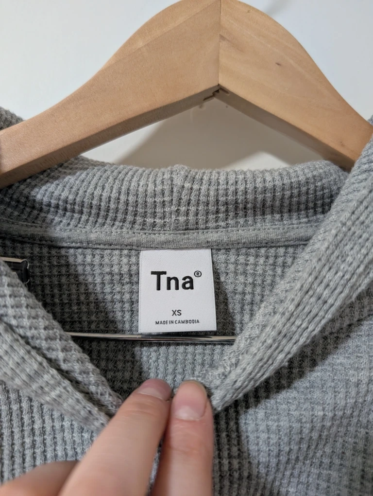 This Tna hoodie is grey with a waffle knit texture. It's a cropped style with a hood and long sleeves. Made in Cambodia.