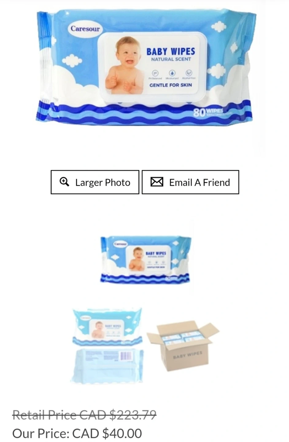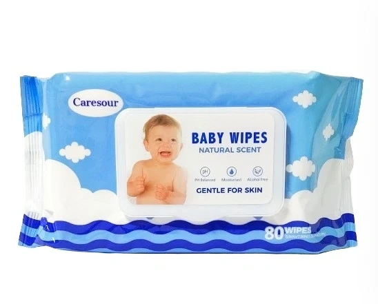 Caresour baby wipes are gentle for skin with a natural scent, 80 wipes per package. Both are alcohol-free.