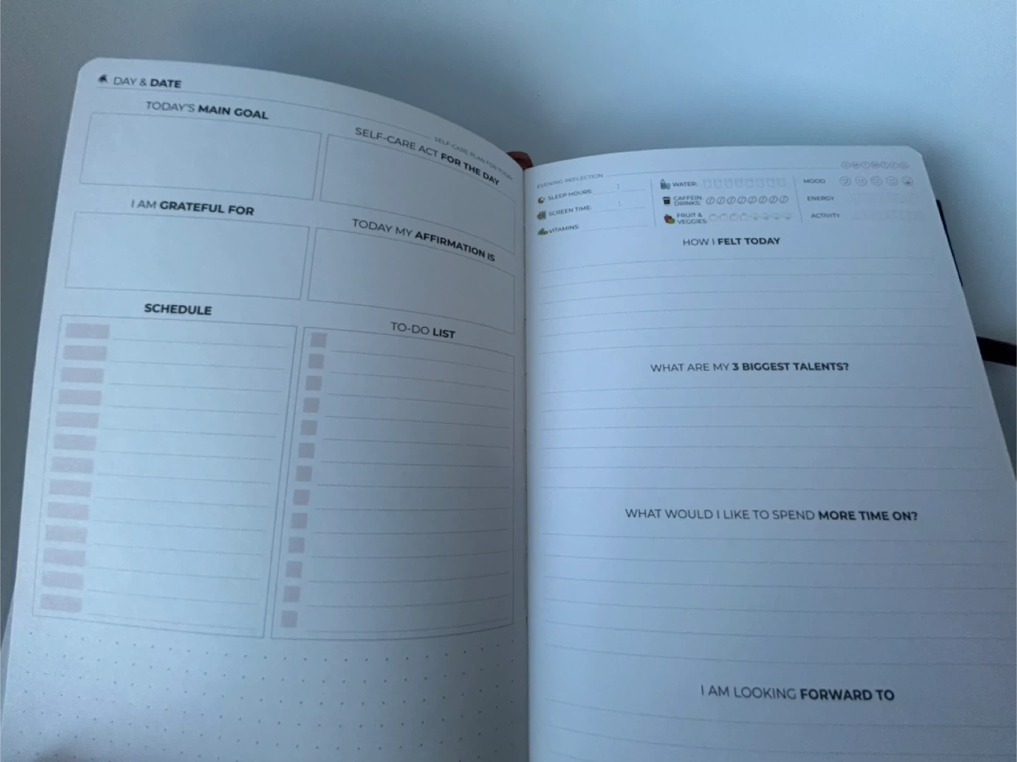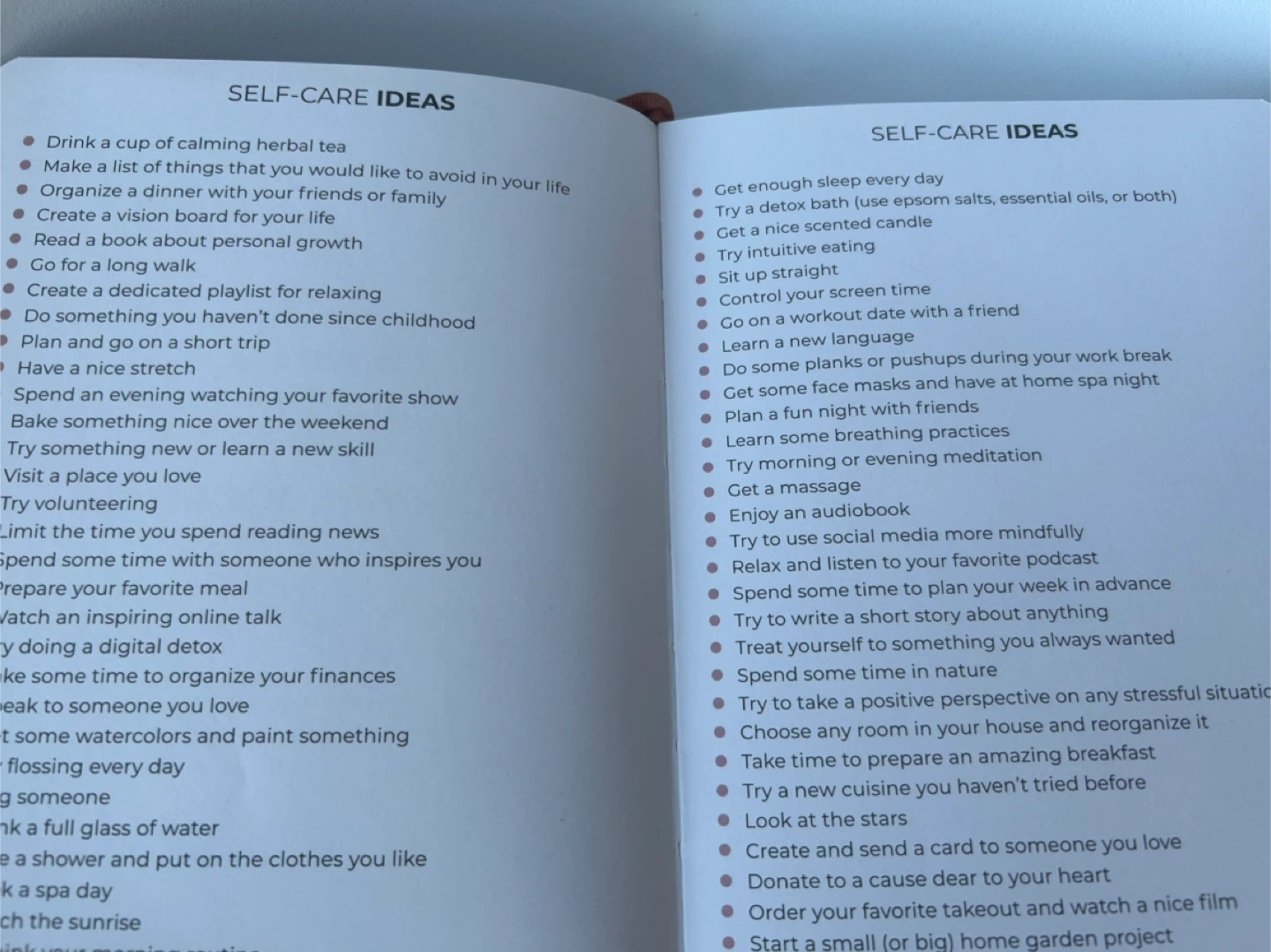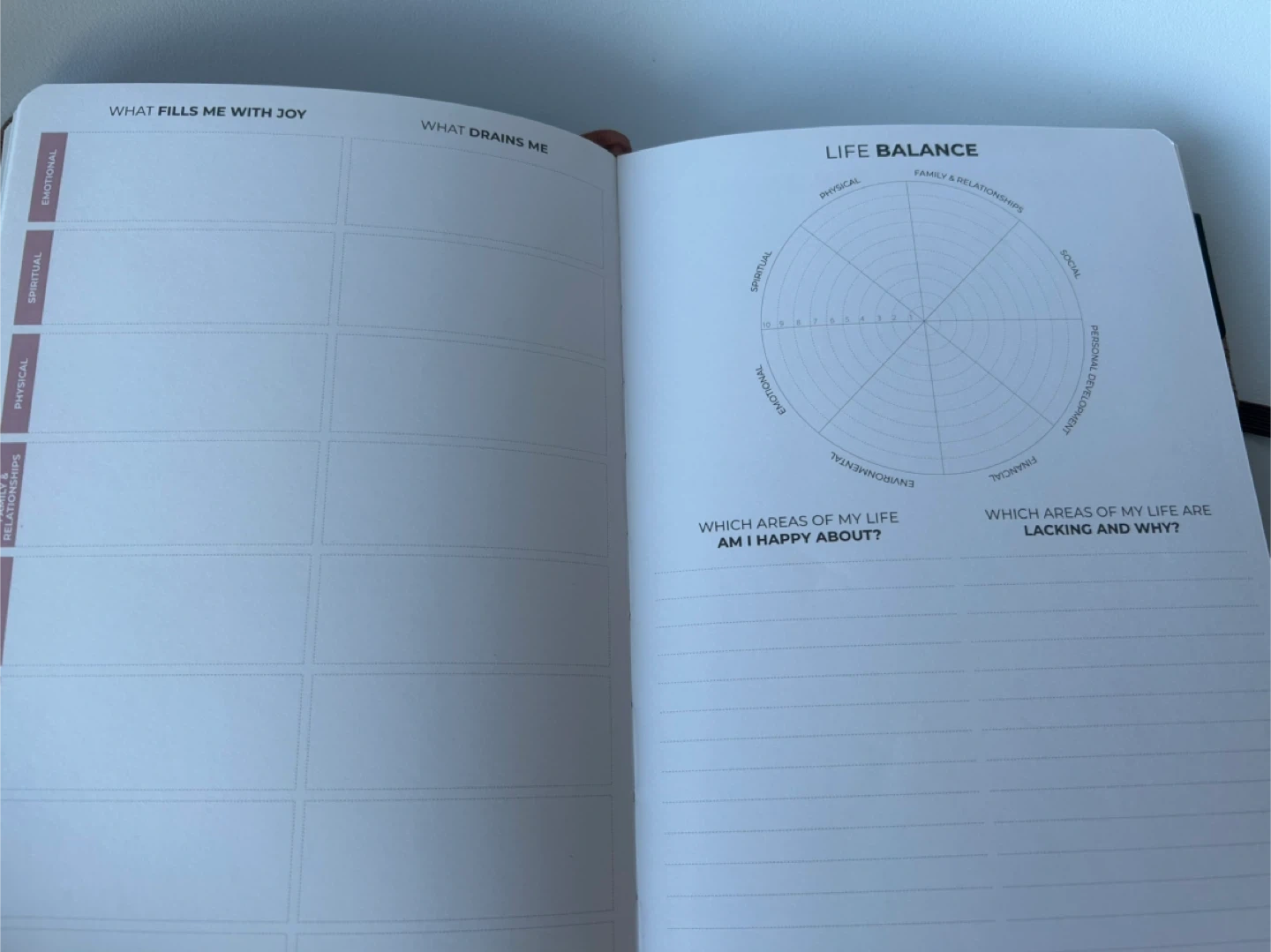 This is a Clever Fox Self-Care Journal with a premium black felt-tip pen for journaling. It includes various sections for personal reflection and planning, such as a life balance wheel and self-care ideas. The journal is bound with an elastic closure and has ribbon bookmarks. It's perfect for anyone looking to prioritize their well-being and mental health.