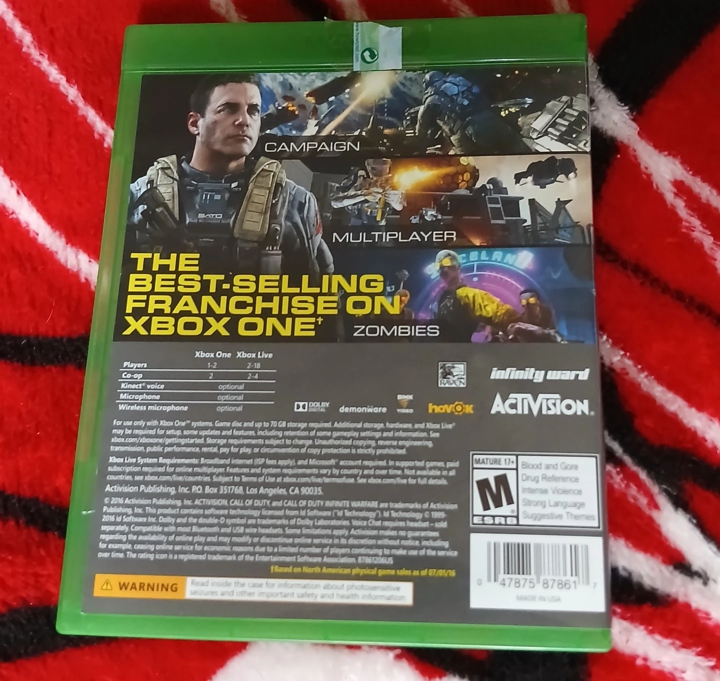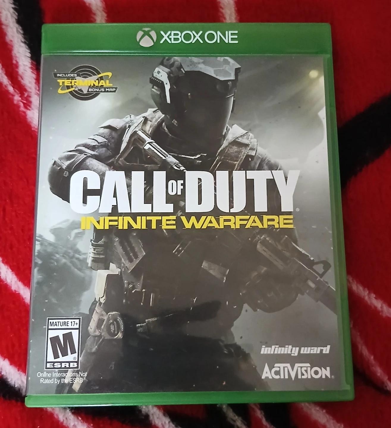 This is Call of Duty: Infinite Warfare for Xbox One. It includes the base game and a bonus Terminal map. ESRB rating is Mature 17+.