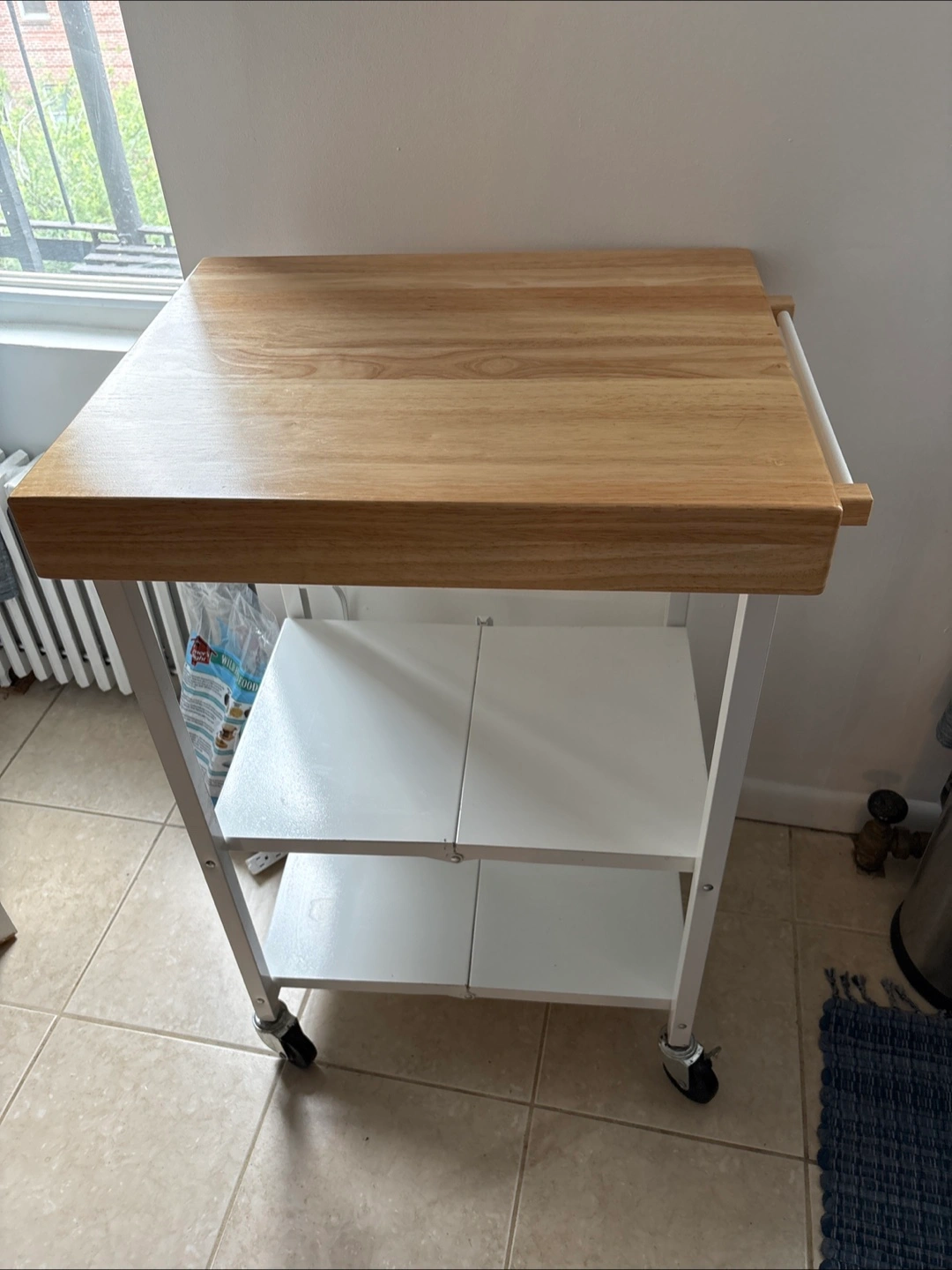A rolling kitchen cart with multiple shelves. The top shelf is wooden. The bottom shelf is white. This would be a great addition to any kitchen or studio. $150 retail price