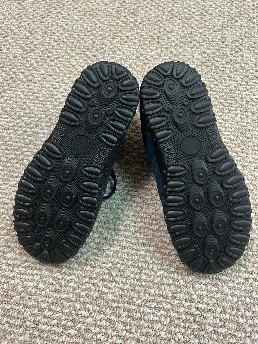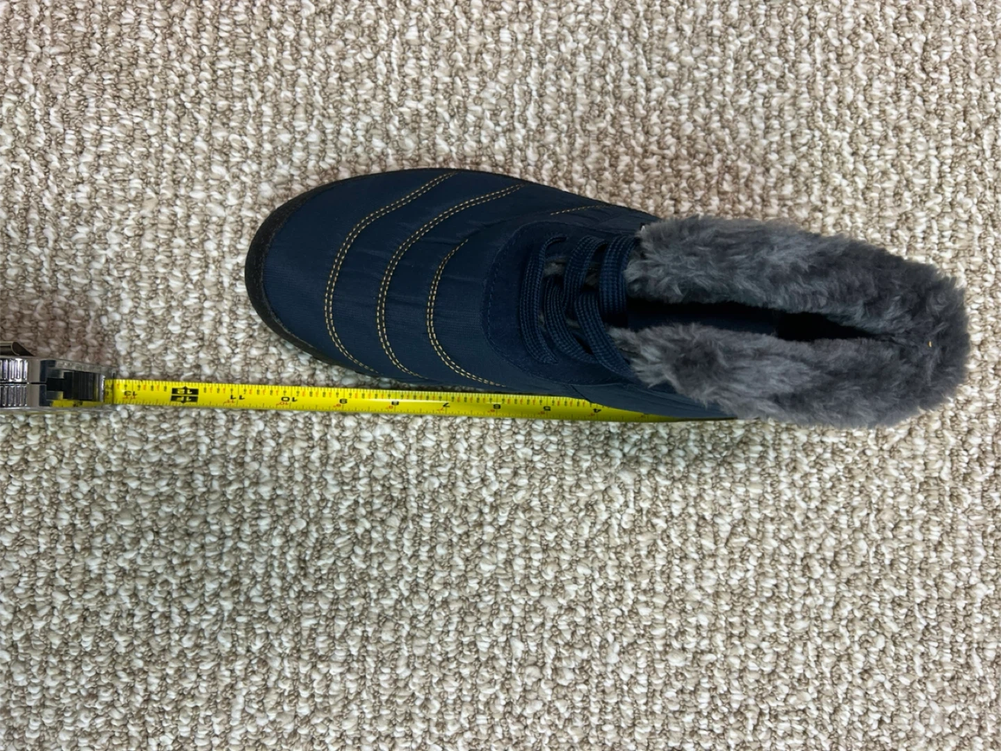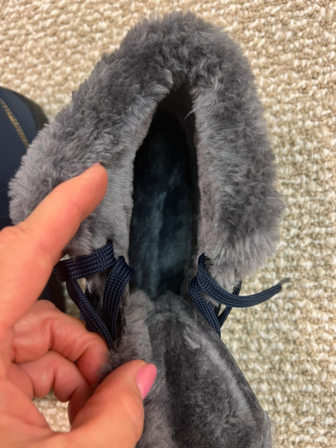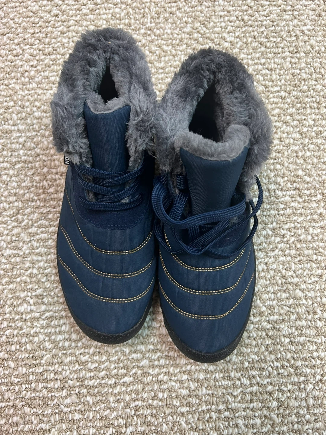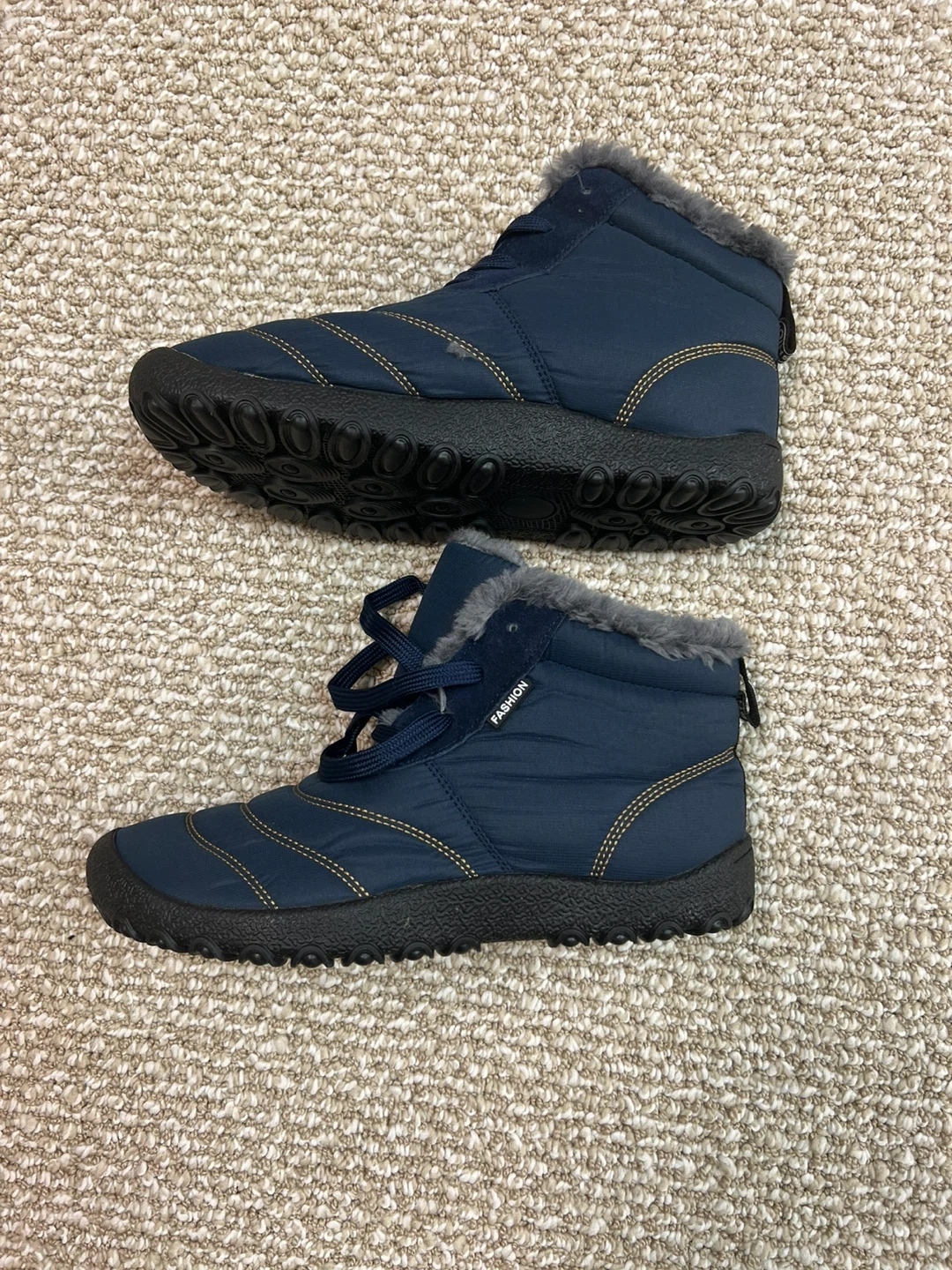 These are a pair of navy blue winter boots with faux fur trim. They are marked as a size 10 and measure approximately 11 inches in length. Perfect for keeping your feet warm and stylish during the colder months!