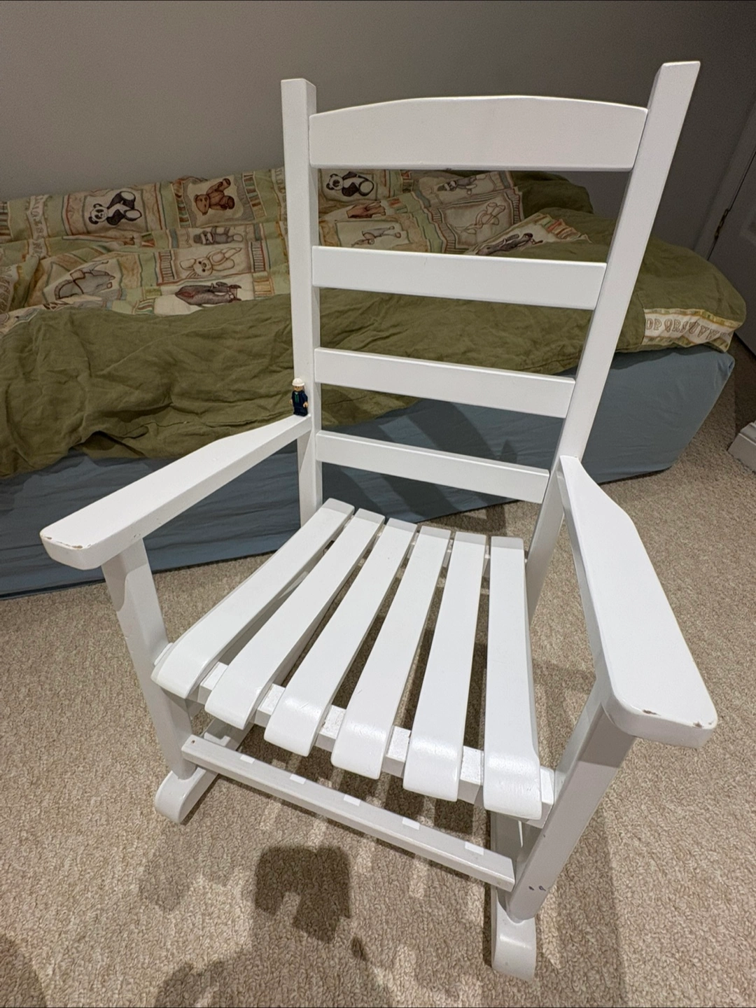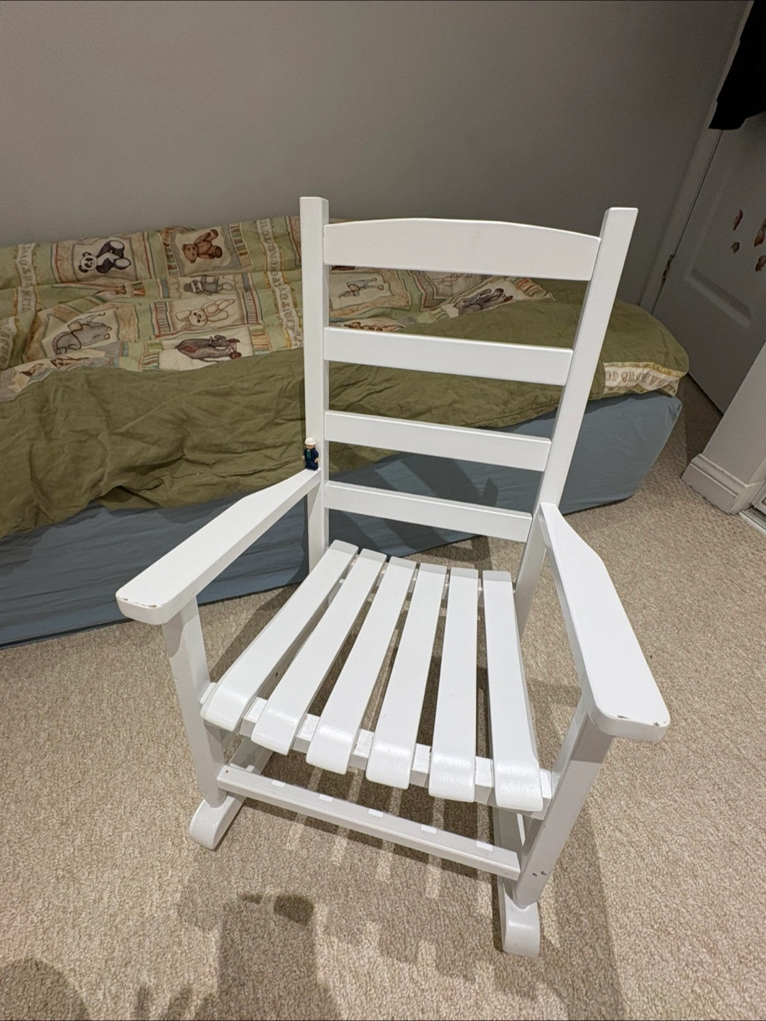 Adorable white wooden rocking chair. Perfect for a child's room or nursery. Features a slatted seat and back. Shows minor wear from use.