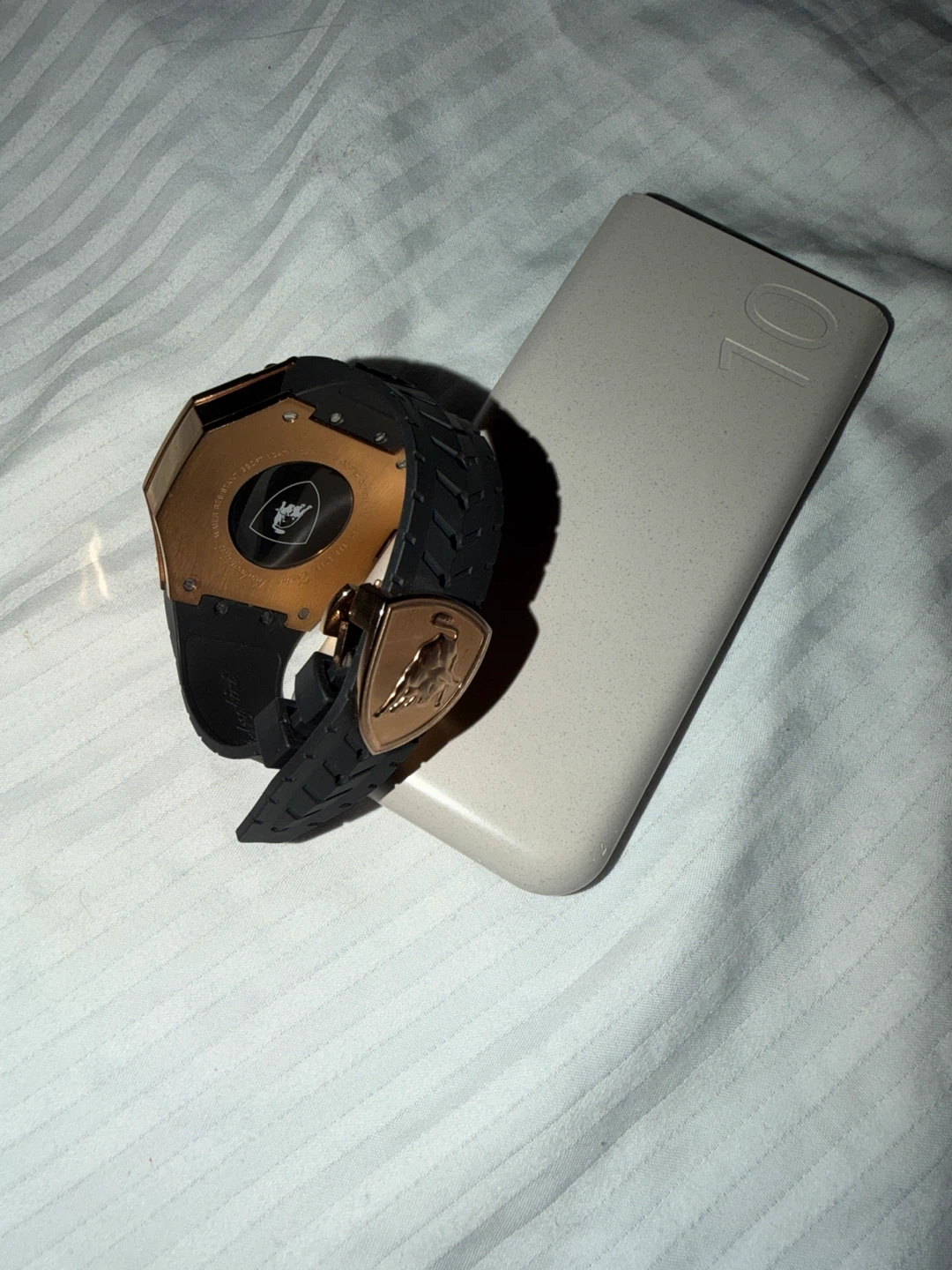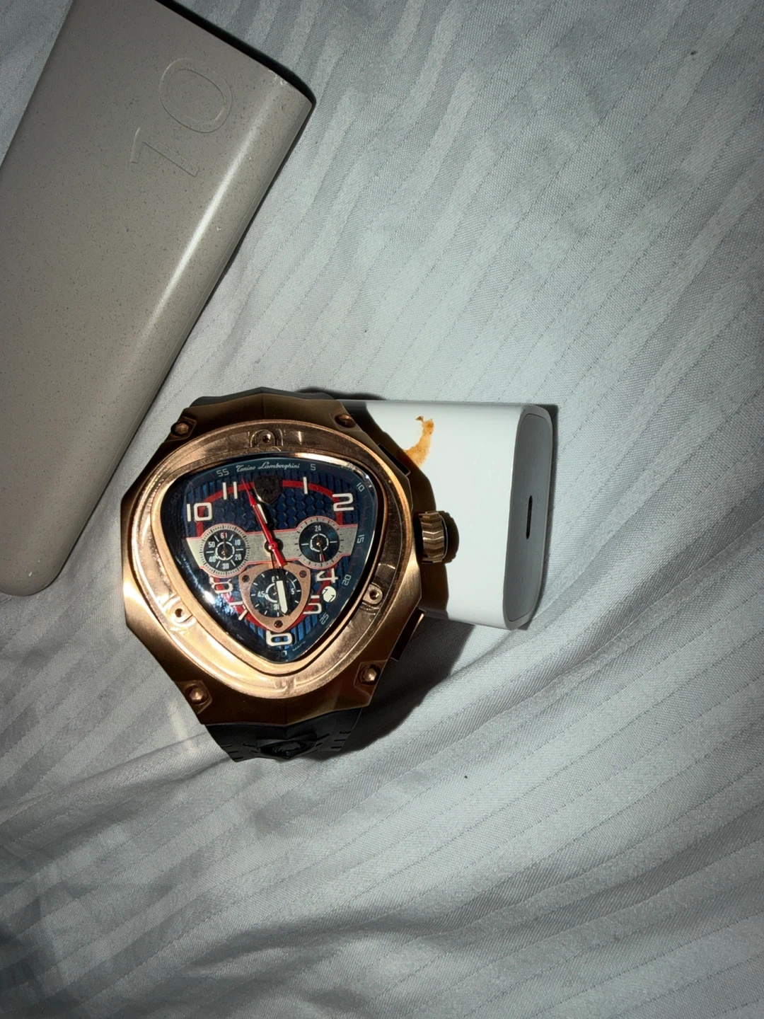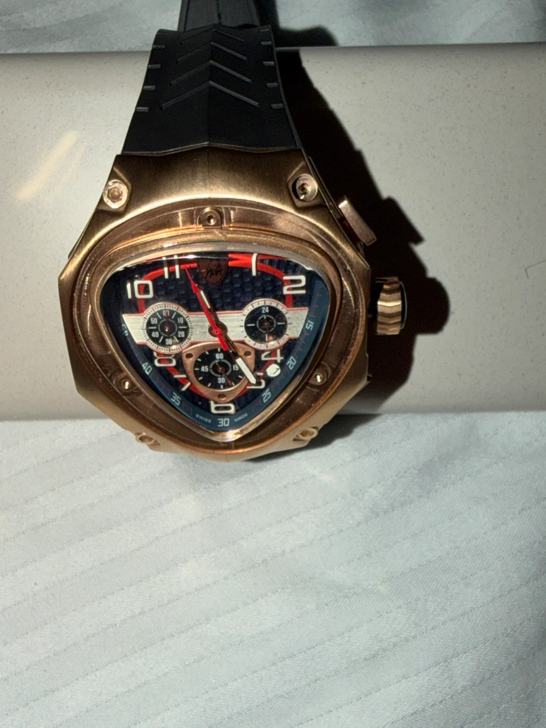 Selling a Lamborghini watch with a distinct triangular face and a black rubber strap. The watch features a bronze-colored case and a detailed dial with multiple subdials. It's in good condition and ready to wear!