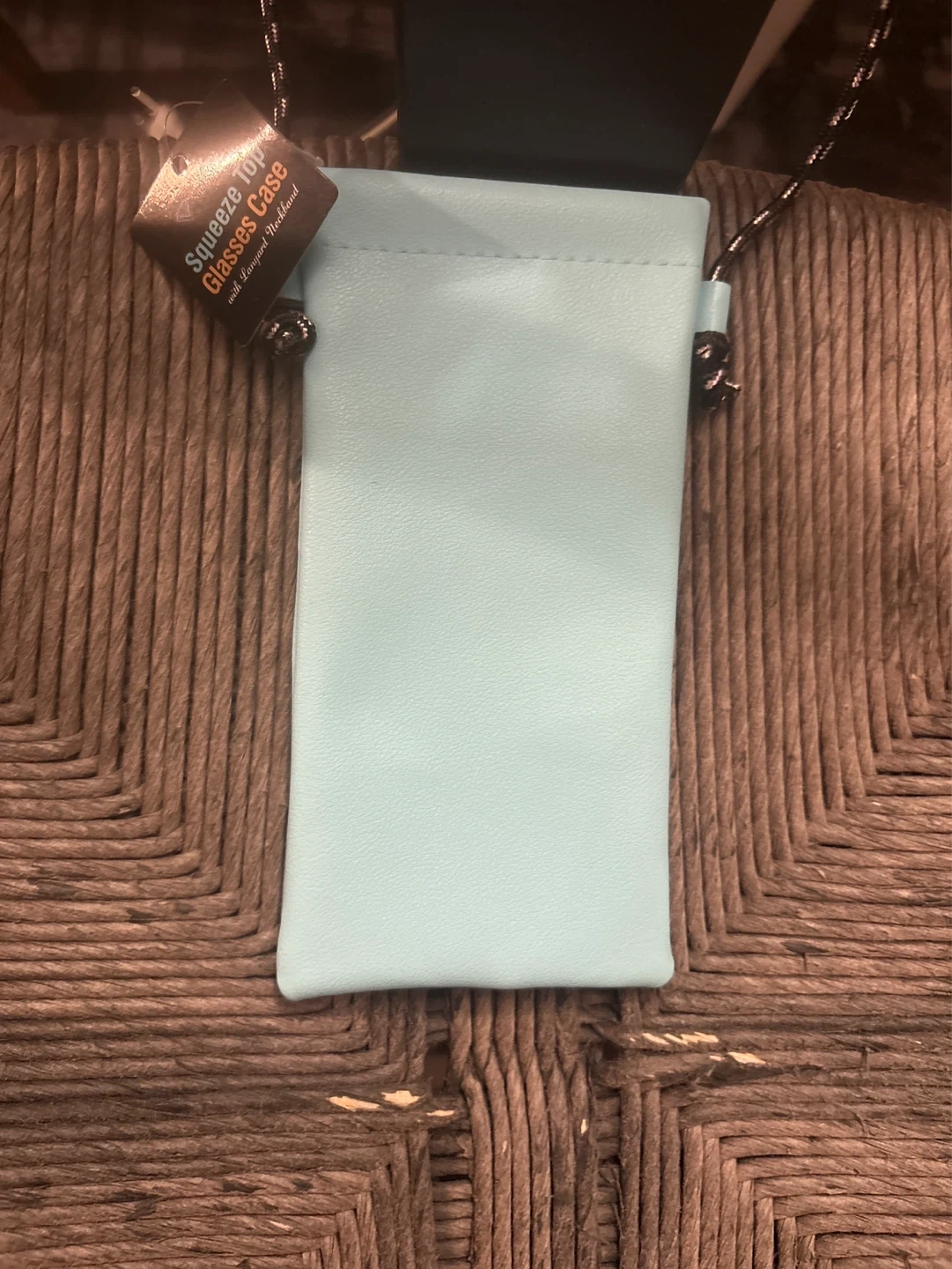 A light blue squeeze top glasses case with a lanyard neckband. It's made of a soft material. It's perfect for keeping your glasses safe and accessible! Brand new never used