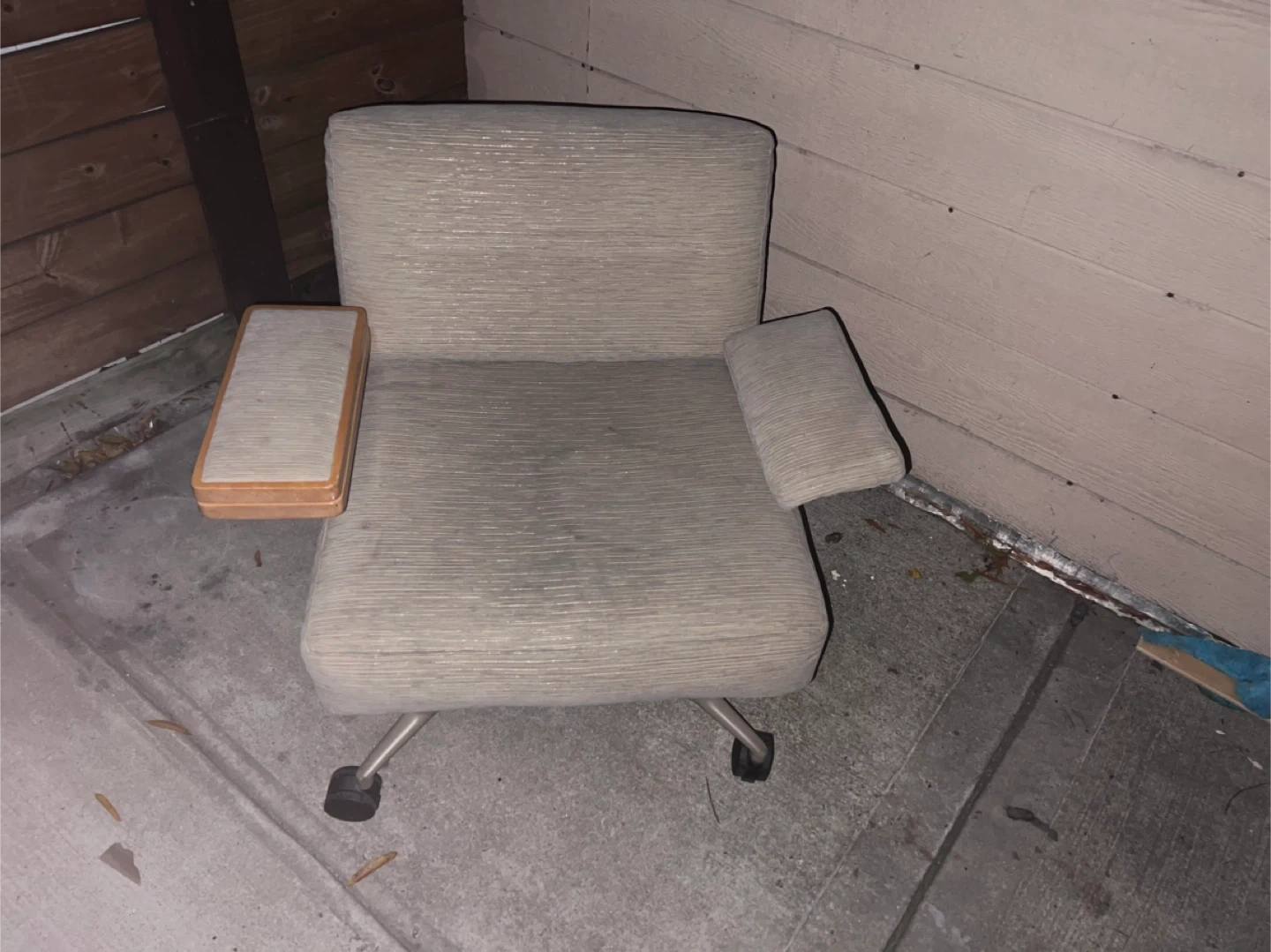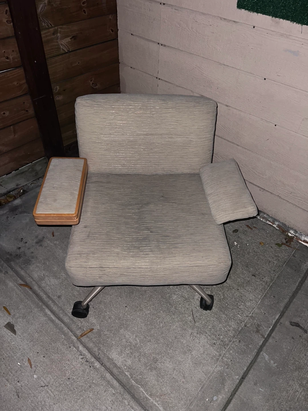 84Here's a comfy armchair with wheels! It's upholstered and has armrests for extra comfort. Perfect for a home office or reading nook Can deliver free if close by. Entrega gratis si esta serca.