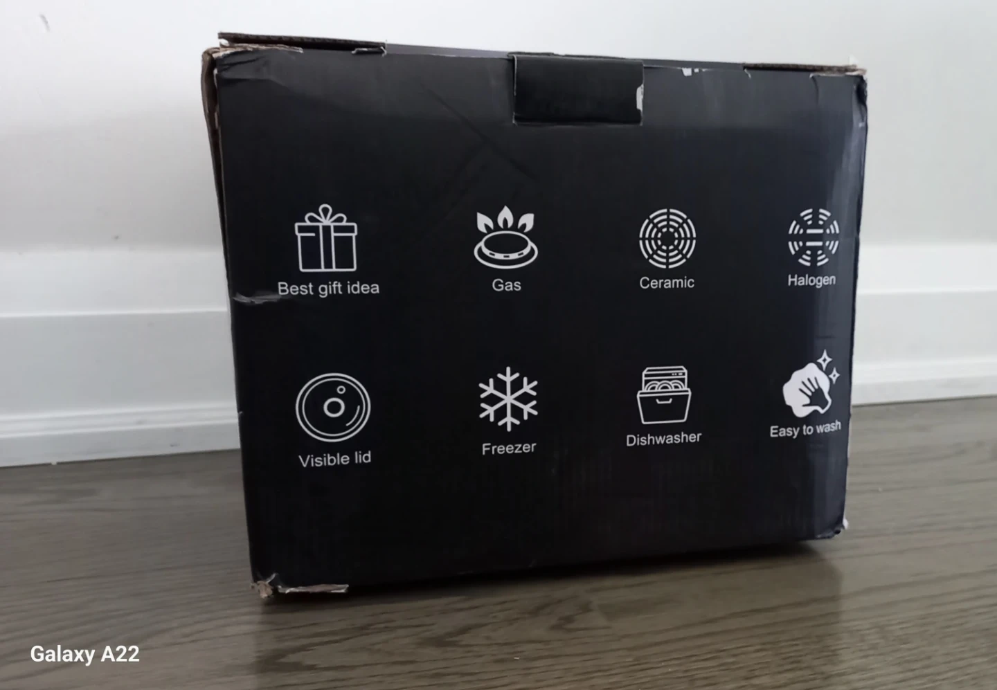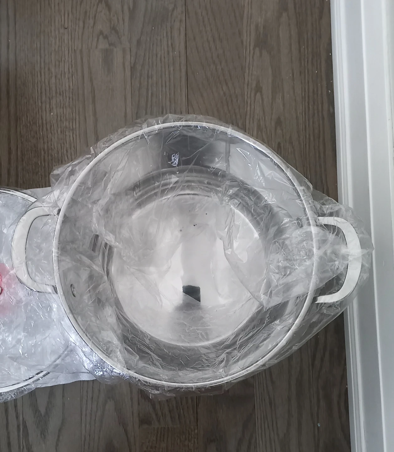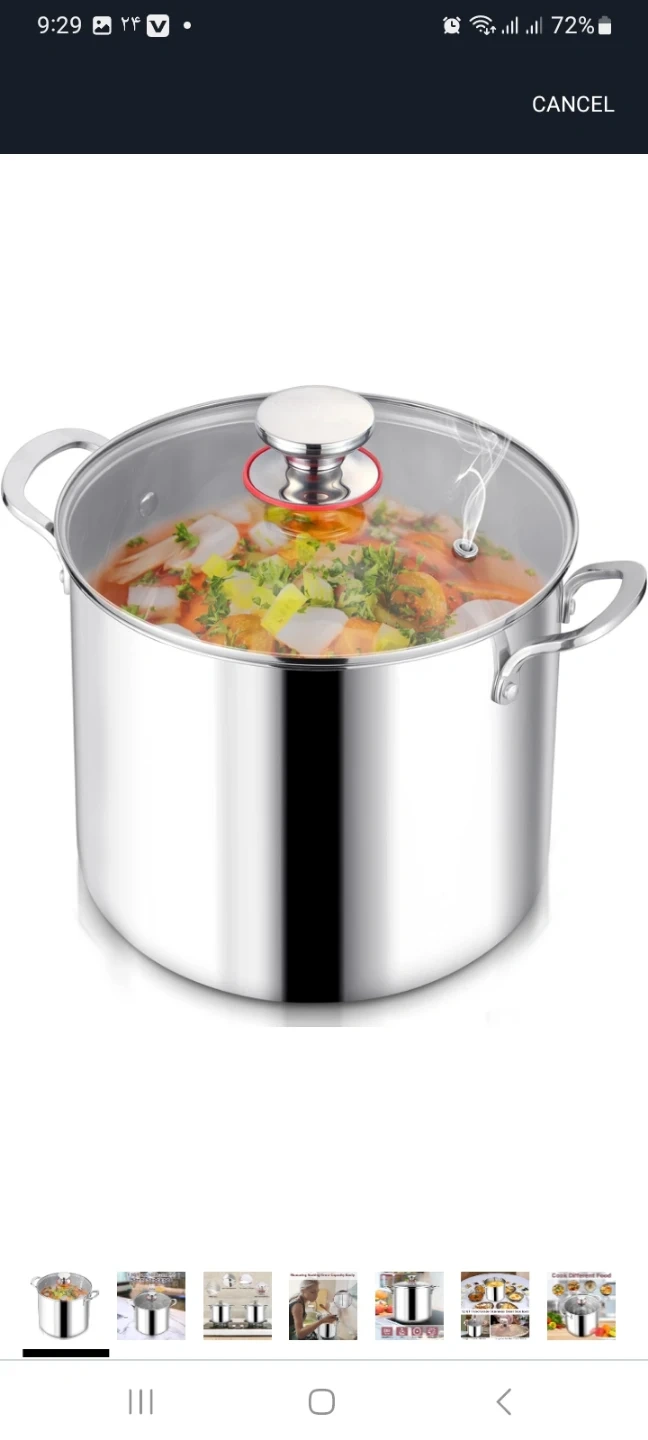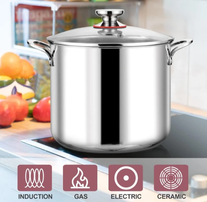 This is a stainless steel stockpot, made with 18/10 stainless steel. It features a clear glass lid with a handle and measures 9 inches tall. It's suitable for induction, gas, electric, and ceramic stovetops.