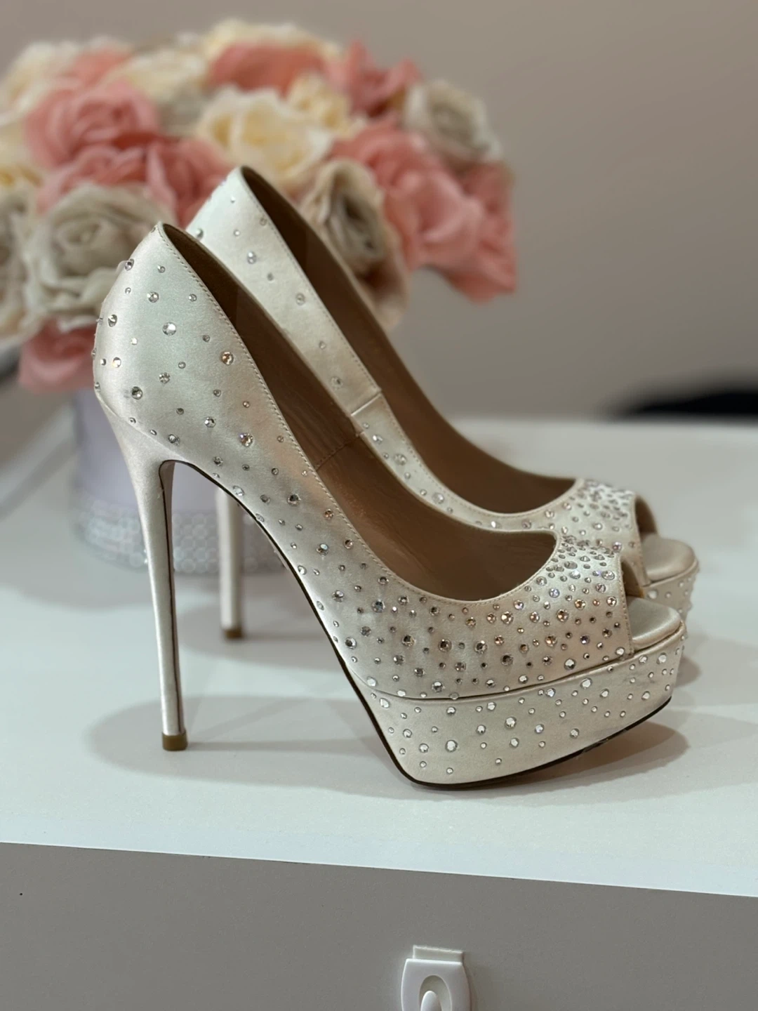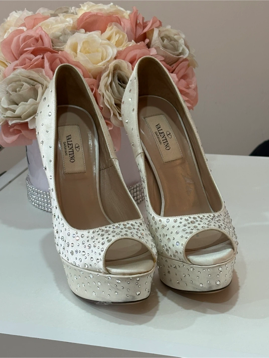 These stunning Valentino Garavani heels feature a satin finish adorned with sparkling crystals. The peep-toe design and platform sole add a glamorous touch. Perfect for a special occasion!