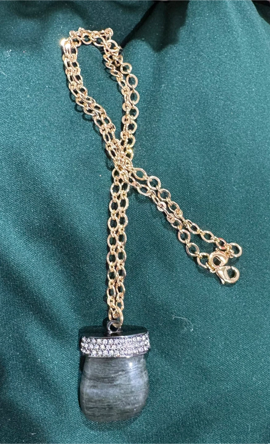 This necklace features a gold-tone chain and a unique stone pendant. The pendant is adorned with small, clear rhinestones around its top. The chain has a secure clasp closure. It's a stylish accessory!