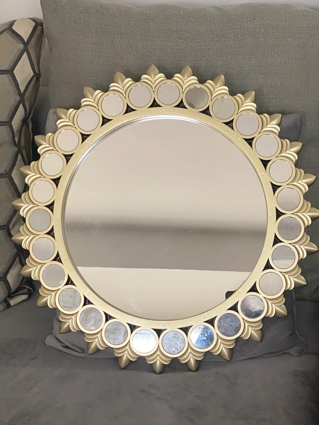 This decorative mirror features a unique sunburst design with a gold-toned frame. It's adorned with multiple small mirrored accents around the central reflective surface. Adds a touch of elegance to any room!