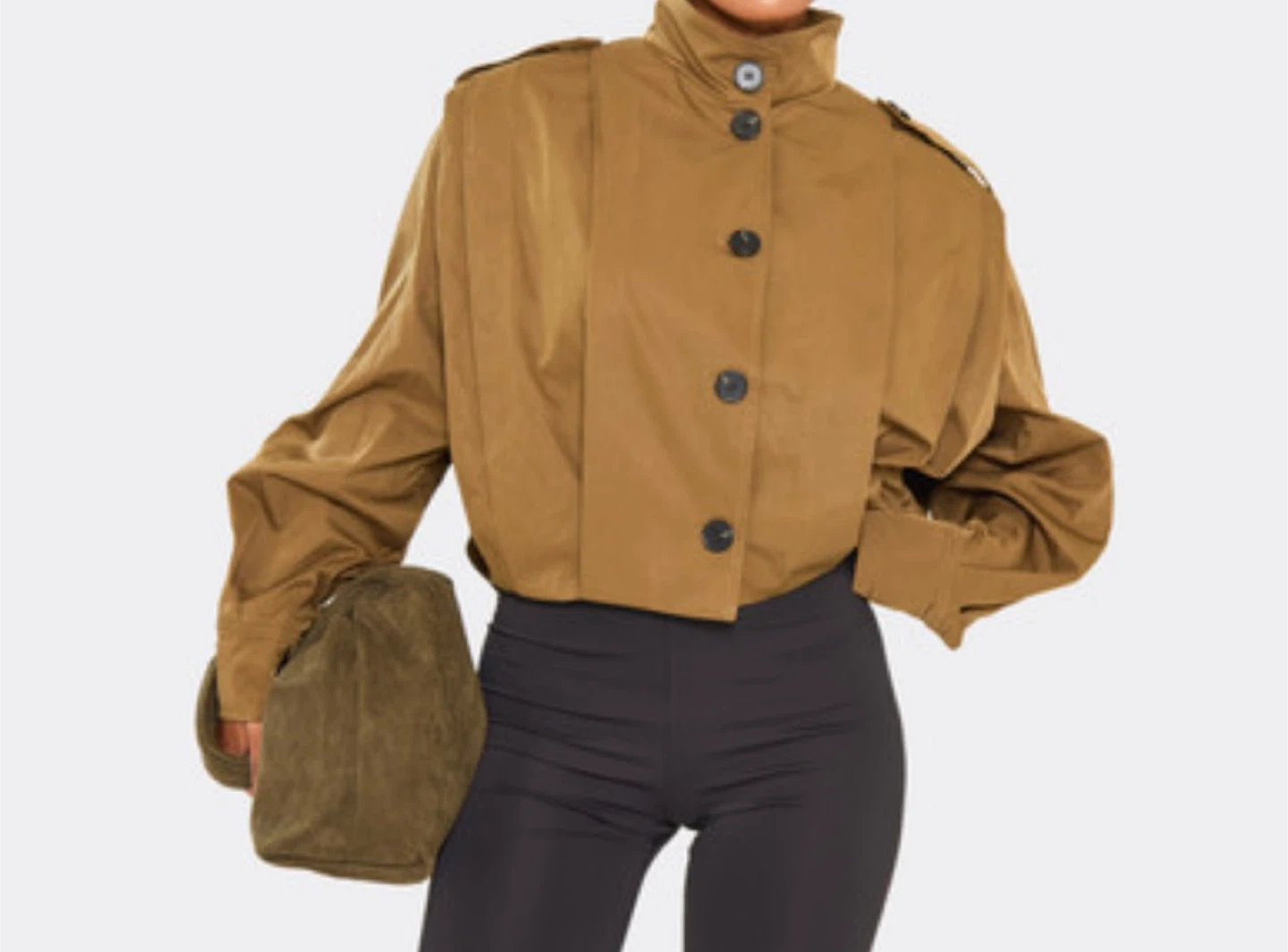 Brown cropped jacket with a high neck and button-up front. Features a loose, blousy sleeve with a fitted cuff. Likely made of a cotton blend or similar fabric. A stylish piece for layering!