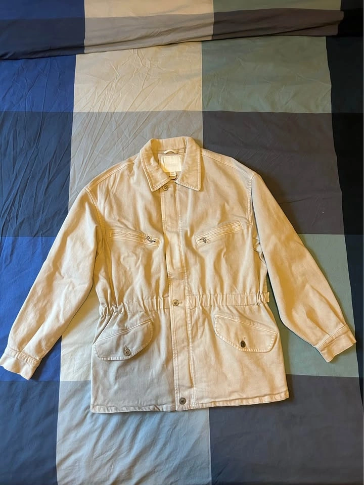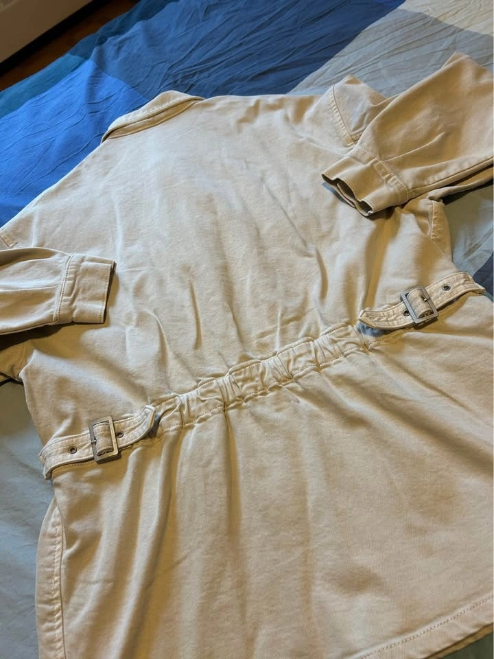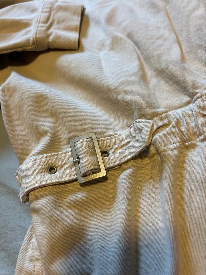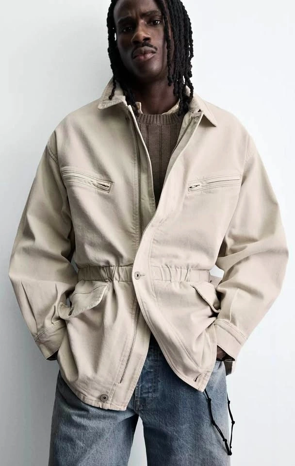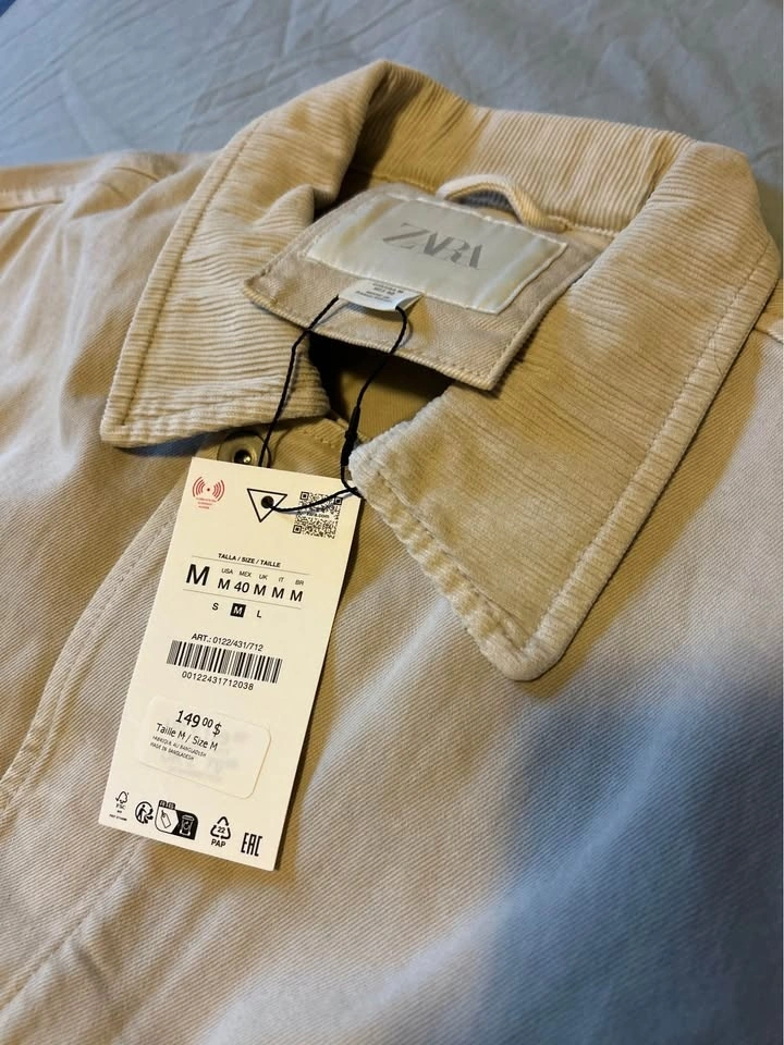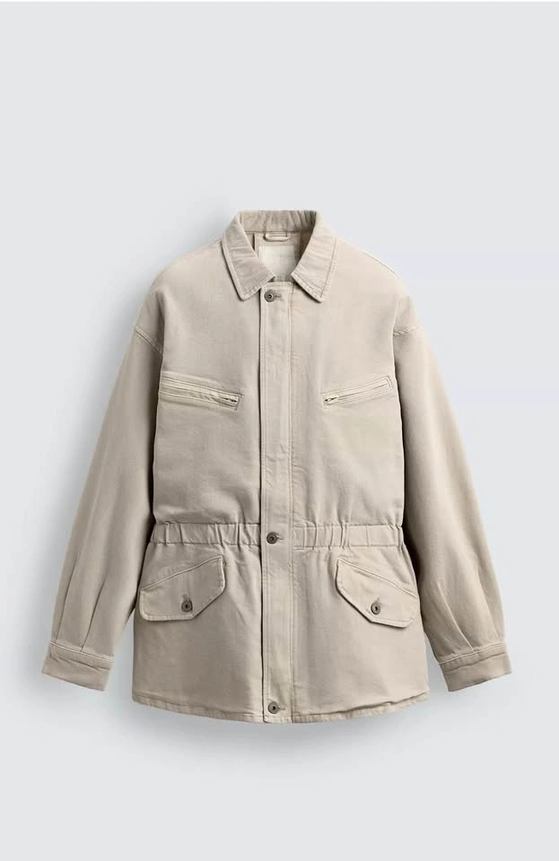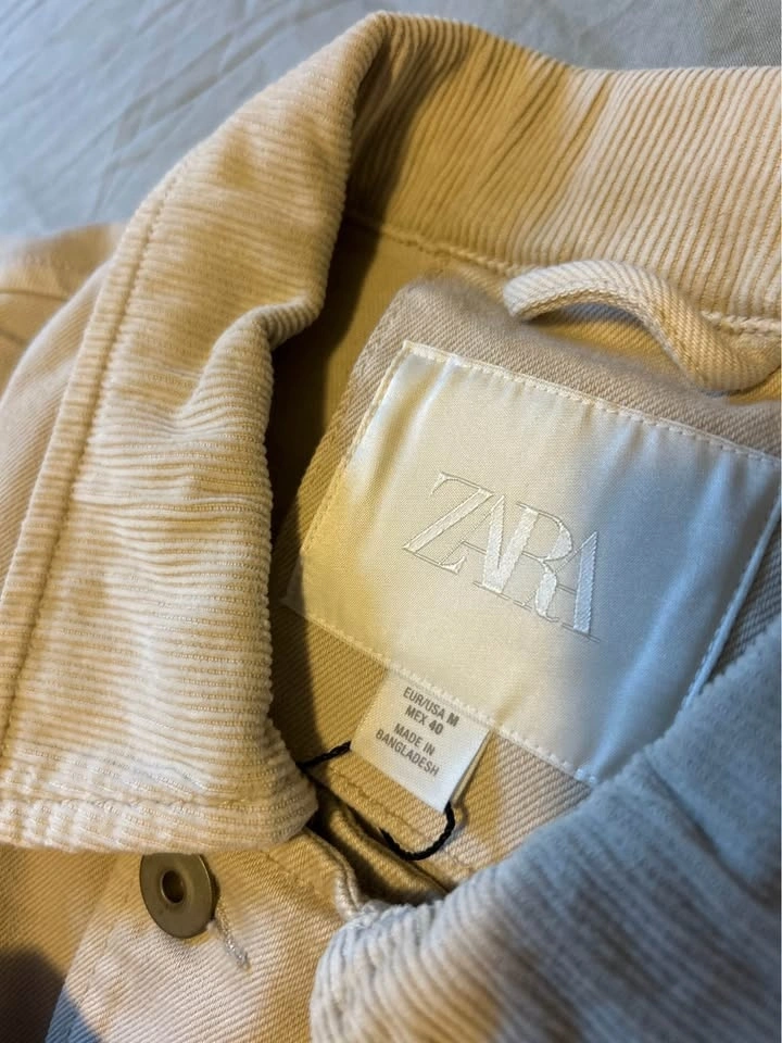 New Zara Relaxed fit denim jacket with a tonal corduroy collar. Features long sleeves with buttoned cuffs, zip-up chest pockets, buttoned hip pockets, and adjustable waist tabs. Front hidden zip closure with a buttoned flap.