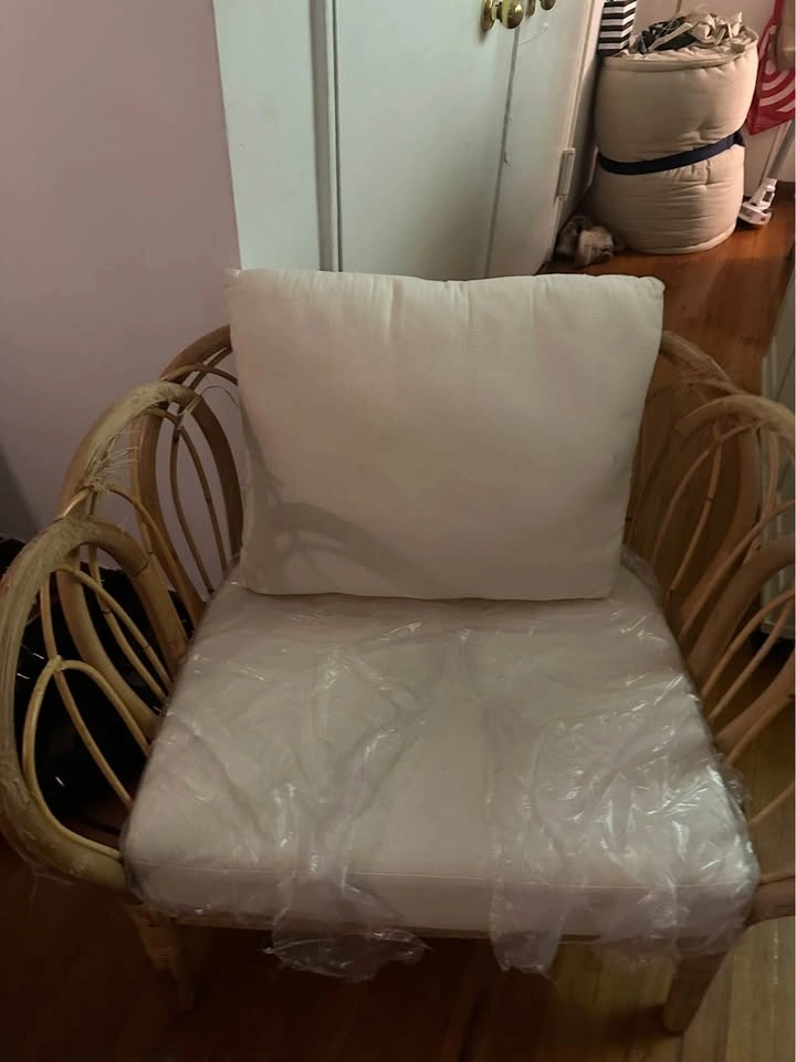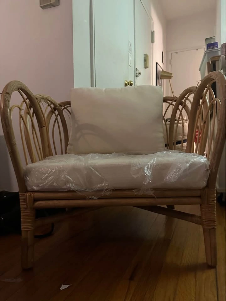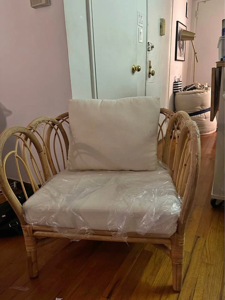 10Hi! Pls Read - I set the condition as Good because although the railing of the rattan is very much chewed up, the base and the structure is in sturdy, great condition. The cushions are also completely clean and had been wrapped in plastic during its entire use. Originally $379! $249 before taxes. Its still very cozy. 😍Cover it with a throw or two and tell people your dog (or mine) did it!🫣 Also can use as a chic pet bed, which is basically what it turned into🫠. (No dog smell, promise) Selling for $85 - Pick up in Hells Kitchen ASAP. By Friday!!!