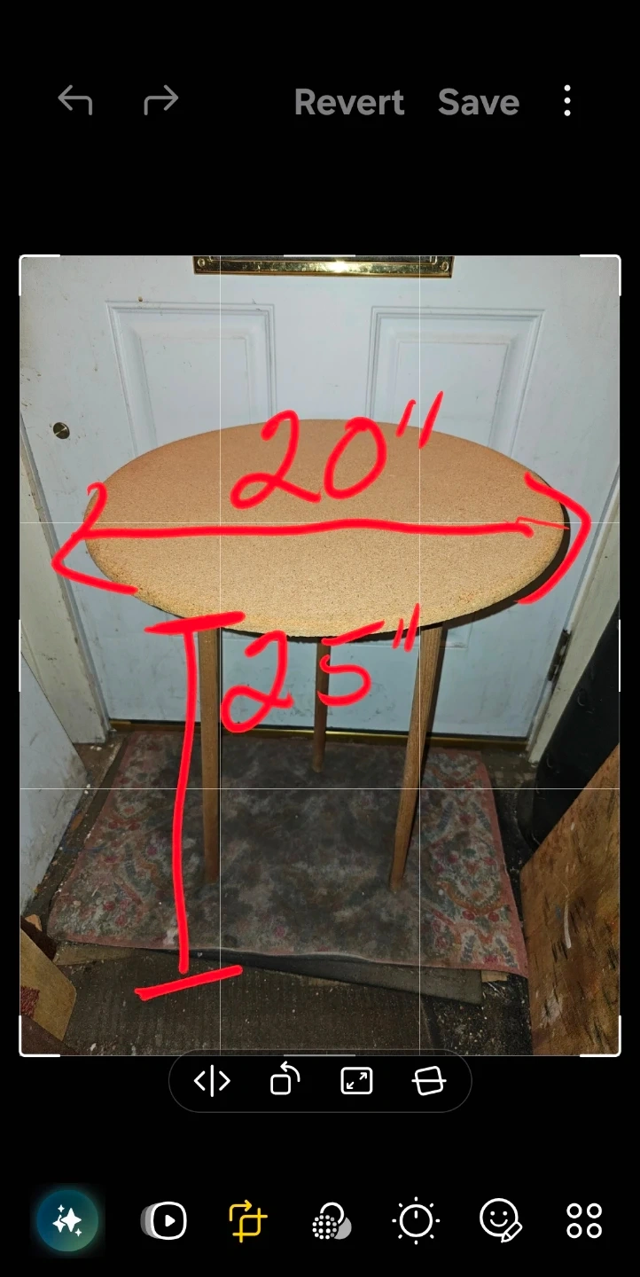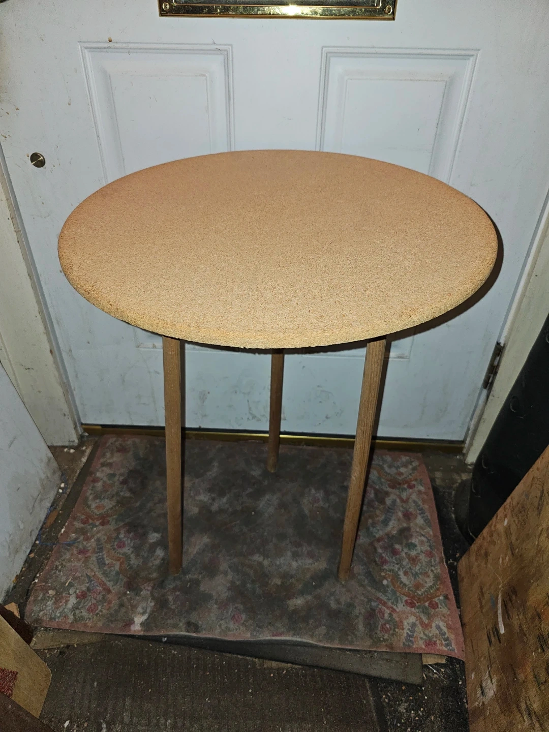 This round side table features a cork top and three wooden legs. The top measures approximately 20 inches in diameter and the table stands about 25 inches tall. It's easy to assemble and disassemble for storage or transport!